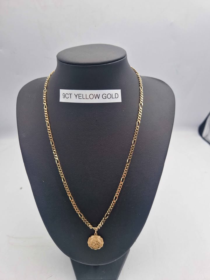 9ct Yellow Gold 3 In 1 Figaro Chain Necklace With St.Christopher Pendant - 20" Long - 13.9 Grams