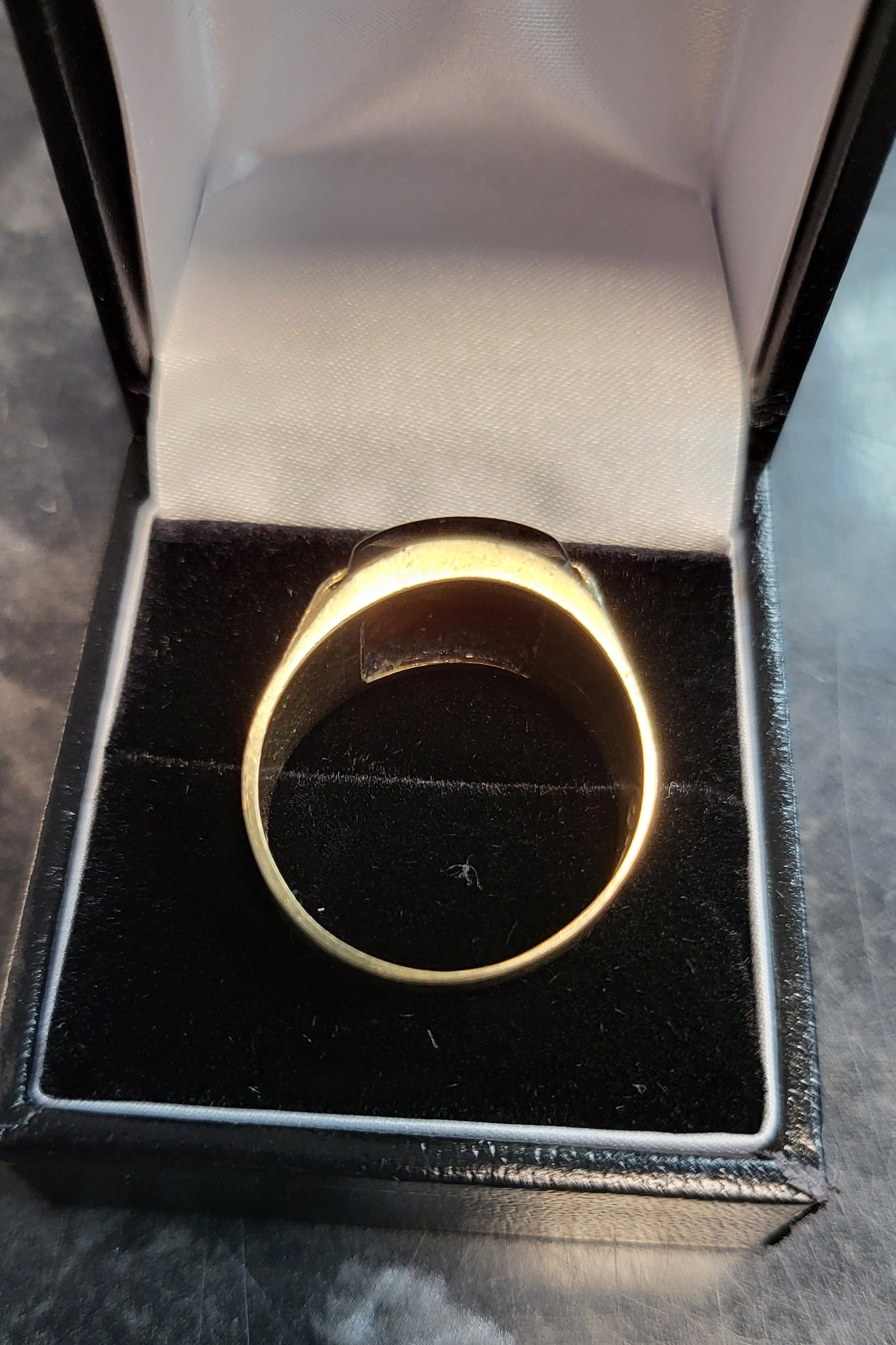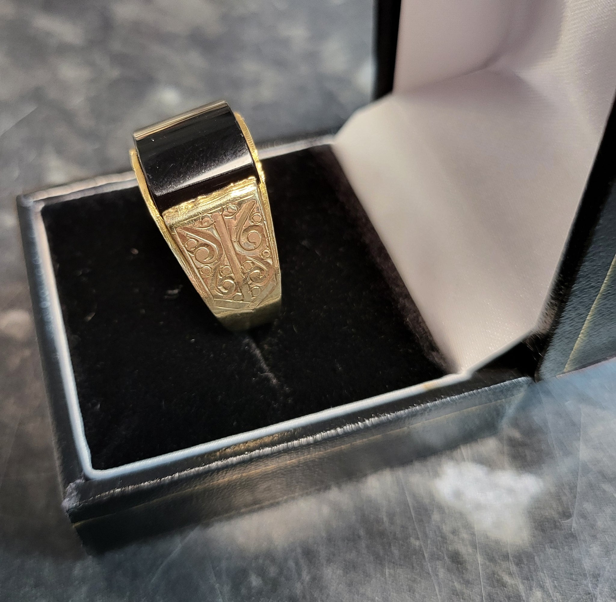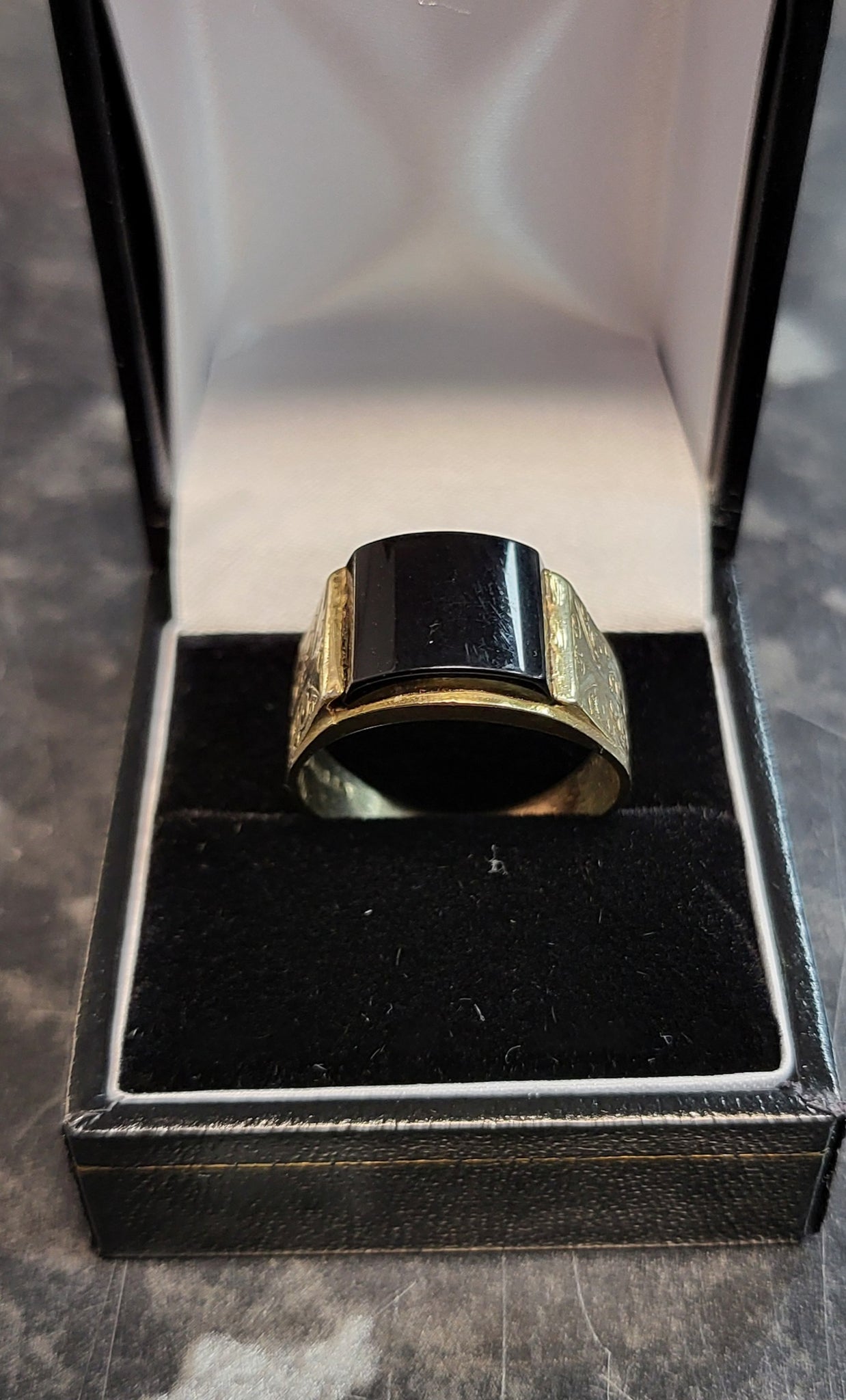 9ct Yellow Gold and Black Stone Ring - Sie T - 6.15g