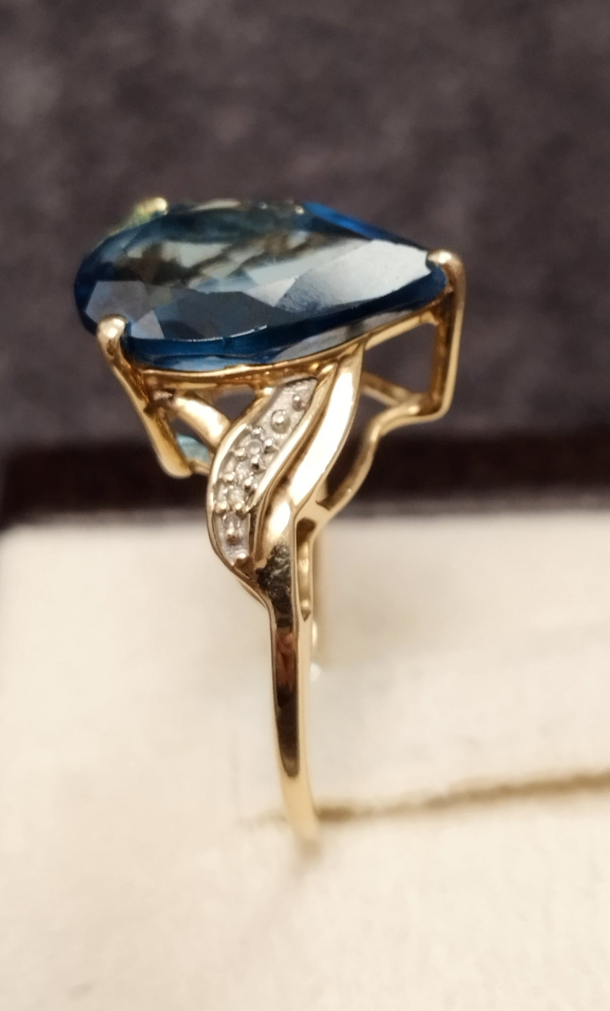 A truly stunning ring crafted in 9ct yellow gold and set with a large pear shaped blue stone. The shoulders are inlayed with white gold and set with clear stones. The beautiful intense blue stone make this a stand out piece giving a look of luxury.