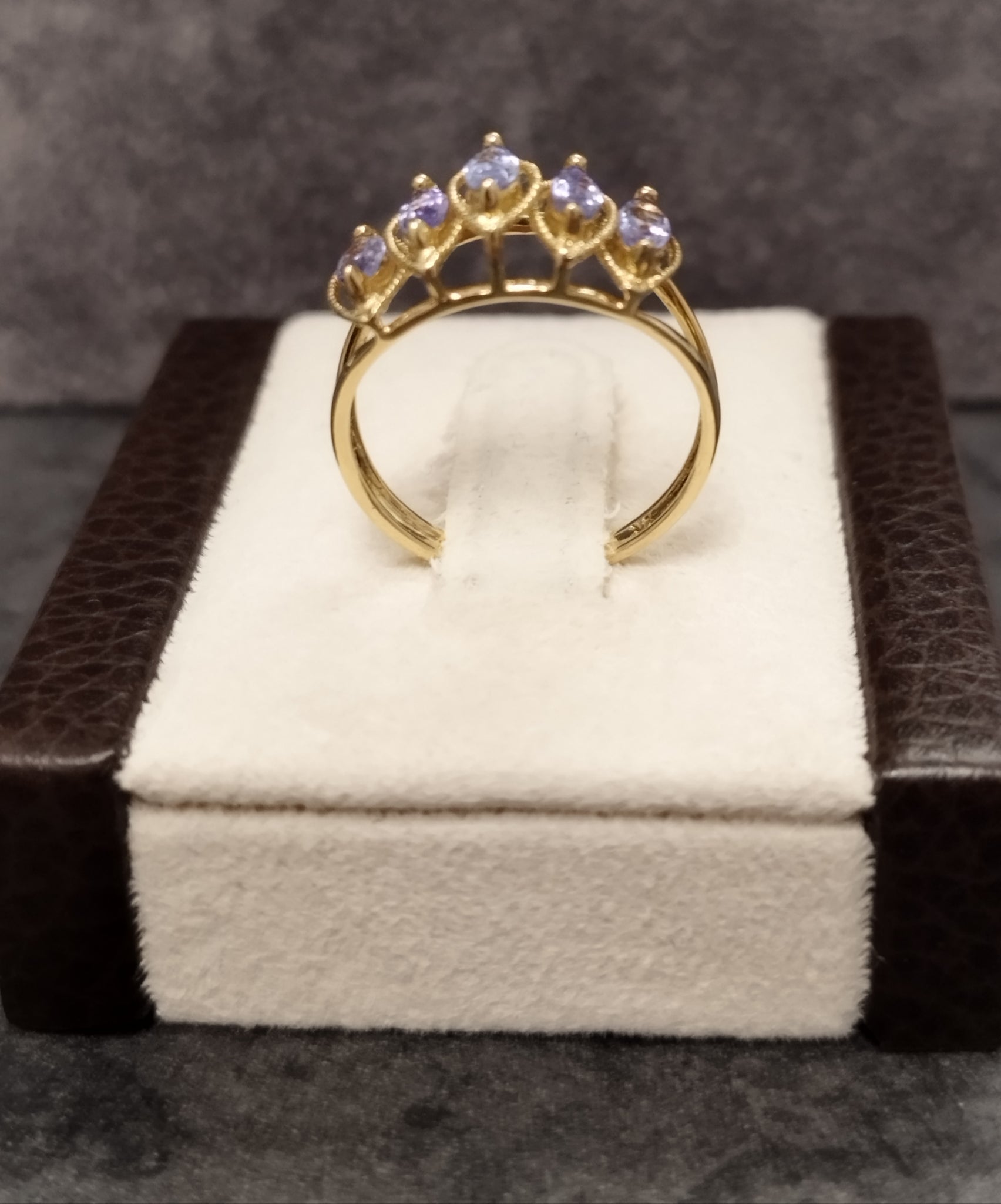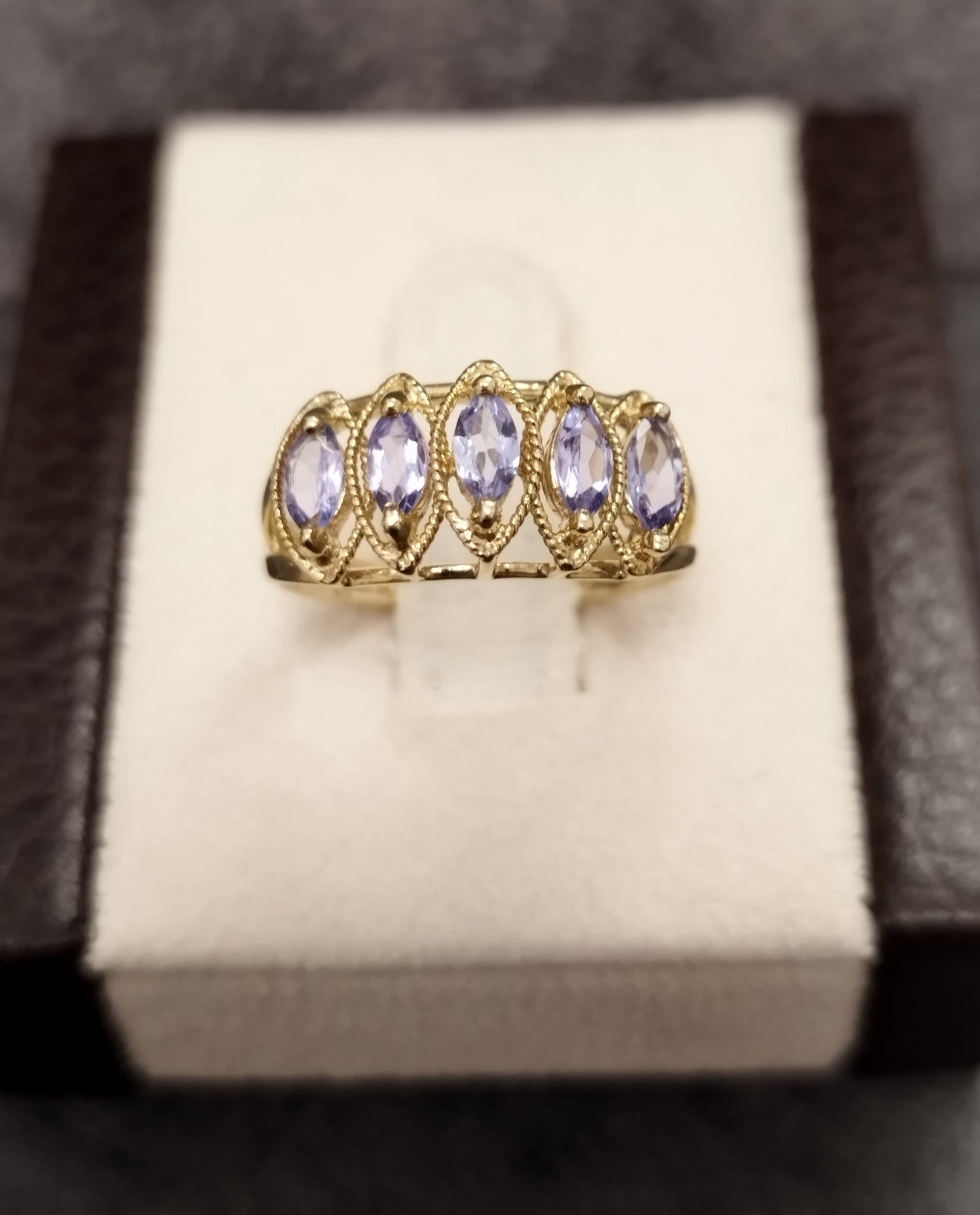 A pretty 9ct yellow gold ring with 5 tiered claw set marquise cut lilac coloured stones. Open V shaped shoulders.