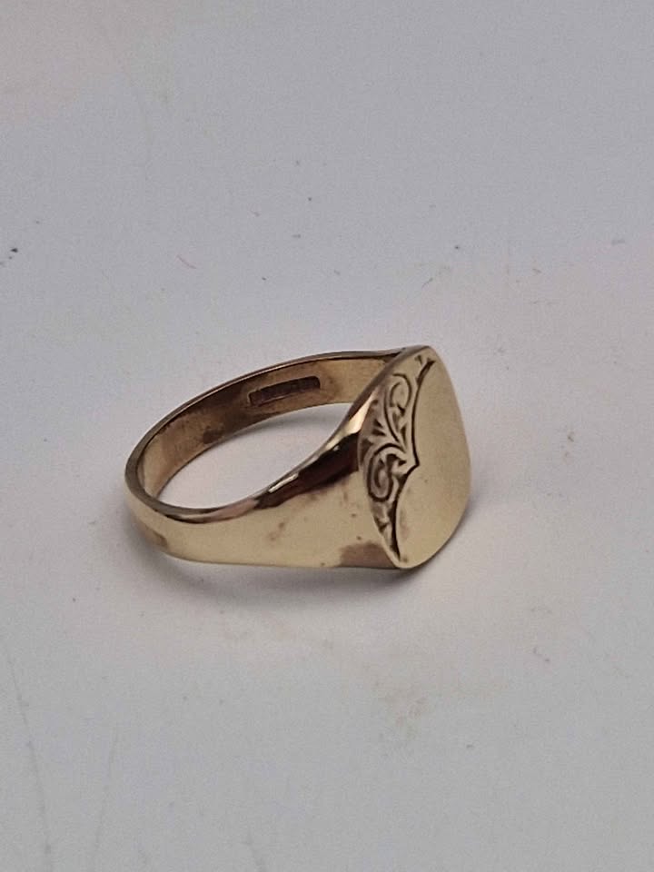 9ct Yellow Gold Mens Flat Signet Ring With Pattern - Size S - 4.64 Grams