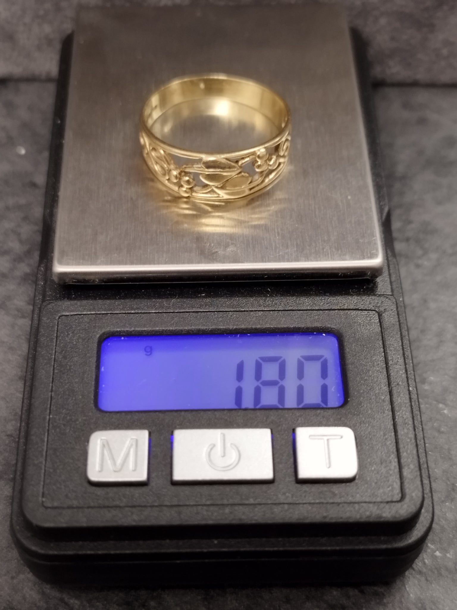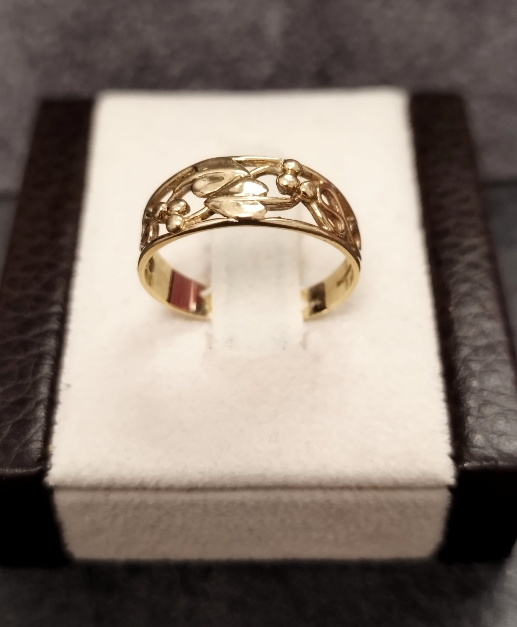 A lovely 9ct yellow gold 'Tree of Life' ring, representing the connection between all things within the cycle of life as well as the connection between heaven & earth. Comprising of open design featuring 2 connected leaves with scroll work joining a solid shank base.