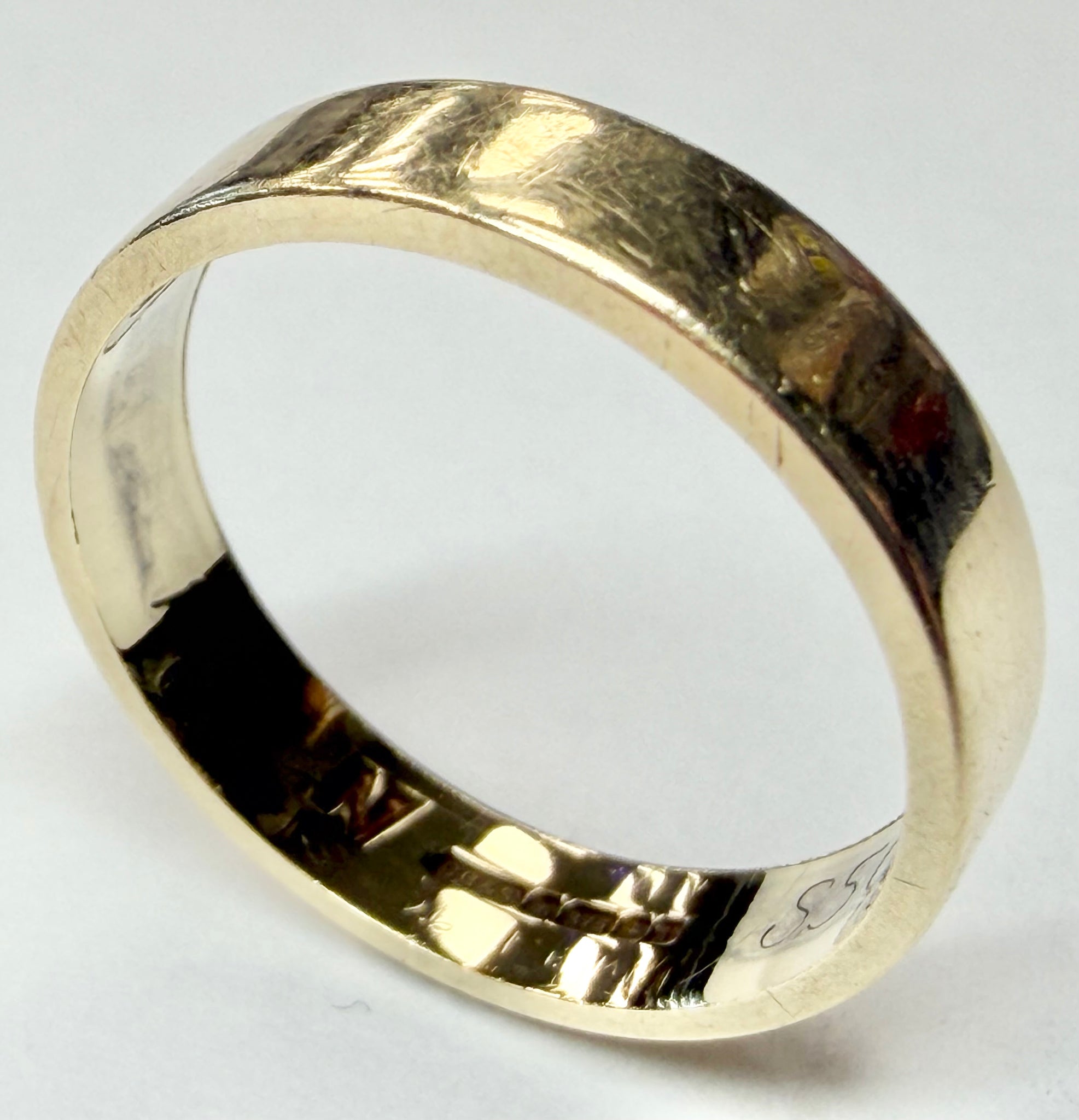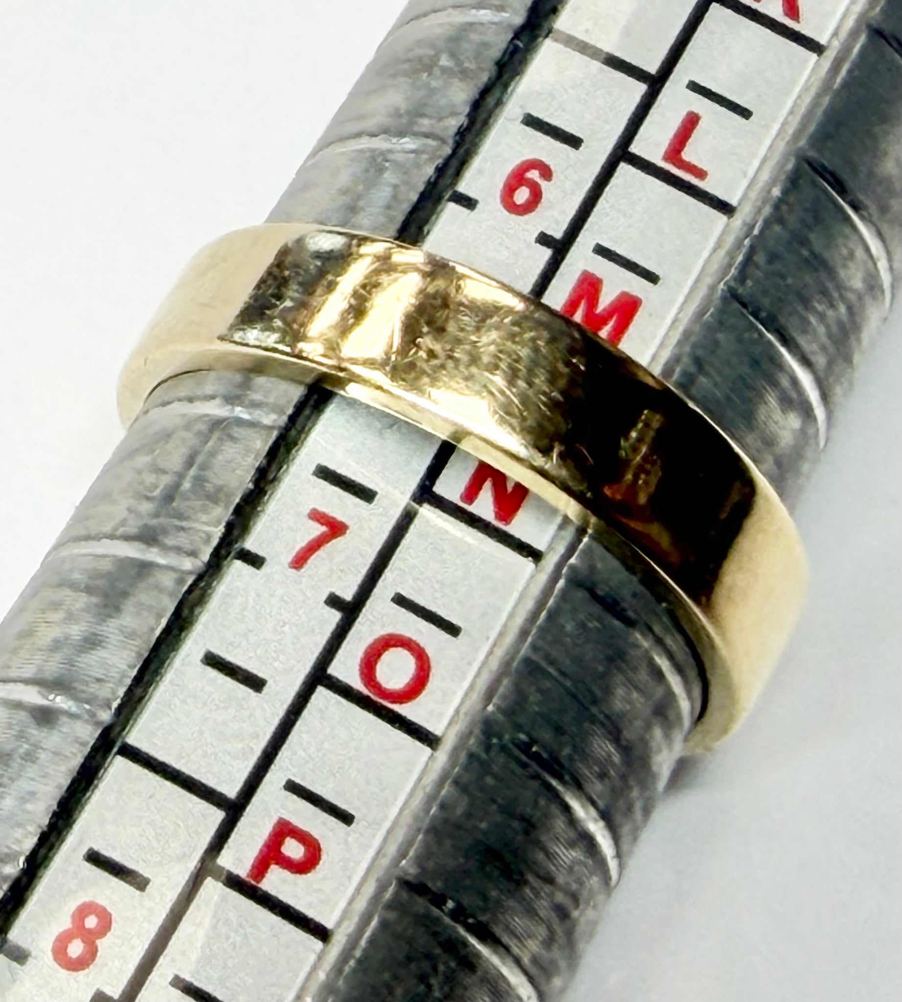 This 9ct yellow gold wedding band ring is a size M 1/2 and weighs 2.97 grams. In good condition.