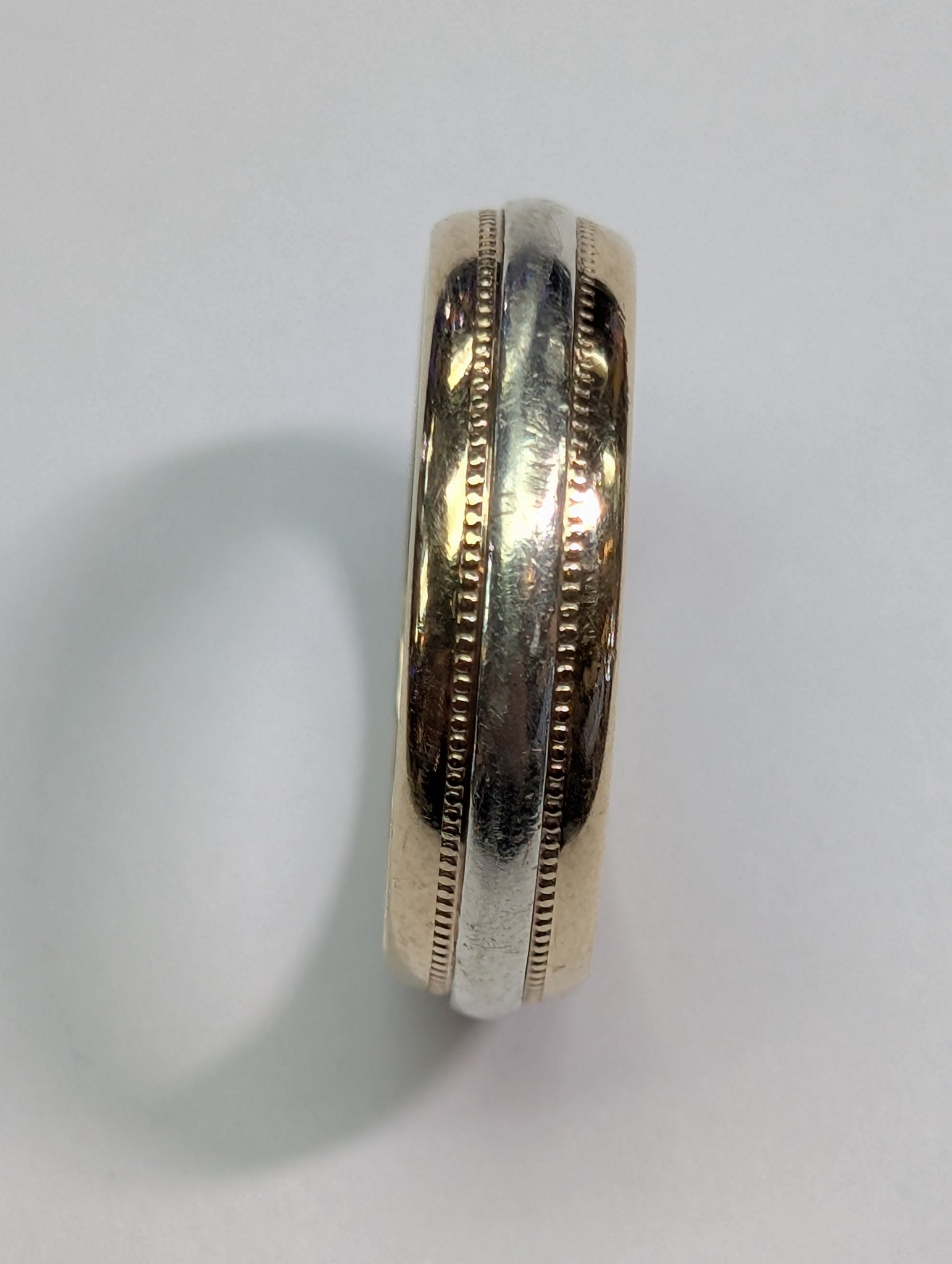 HERE WE HAVE A 9CT WHITE/YELLOW GOLD WEDDING BAND RING. THIS IS A SIZE T AND WEIGHS 5.34G. ** FOR ANY QUERIES PLEASE CALL OUR PRESTON STORE DIRECT MON-SAT 01772 204889