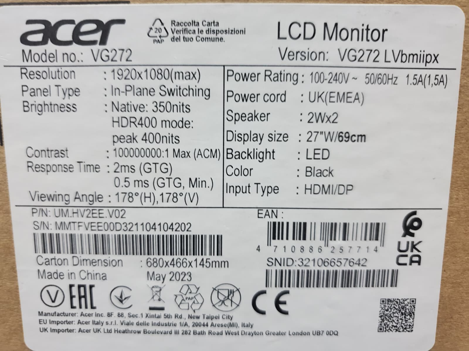Acer 27'' VG272 Monitor Excellent working condition, with box and power lead Fast free shipping