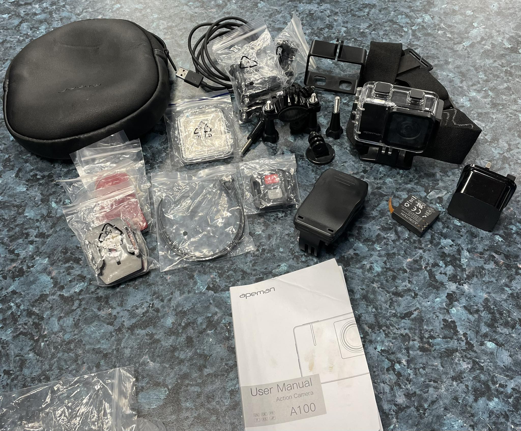 Apeman A100 Action Camera Comes with the case and accessories as it shown in photos. Good working condition.