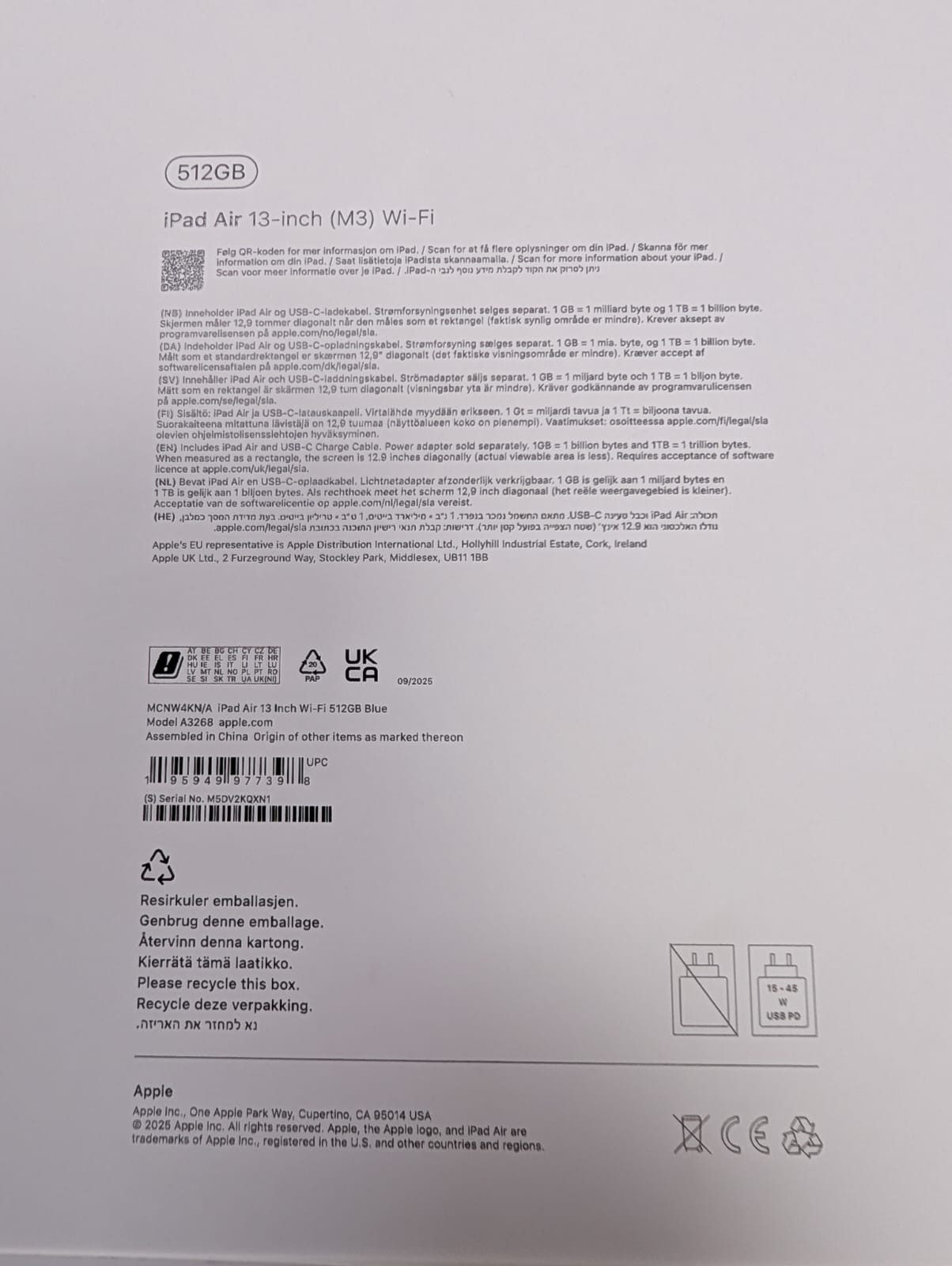 Apple iPad Air, M3, 13 Inch, WiFi, 512GB Blue