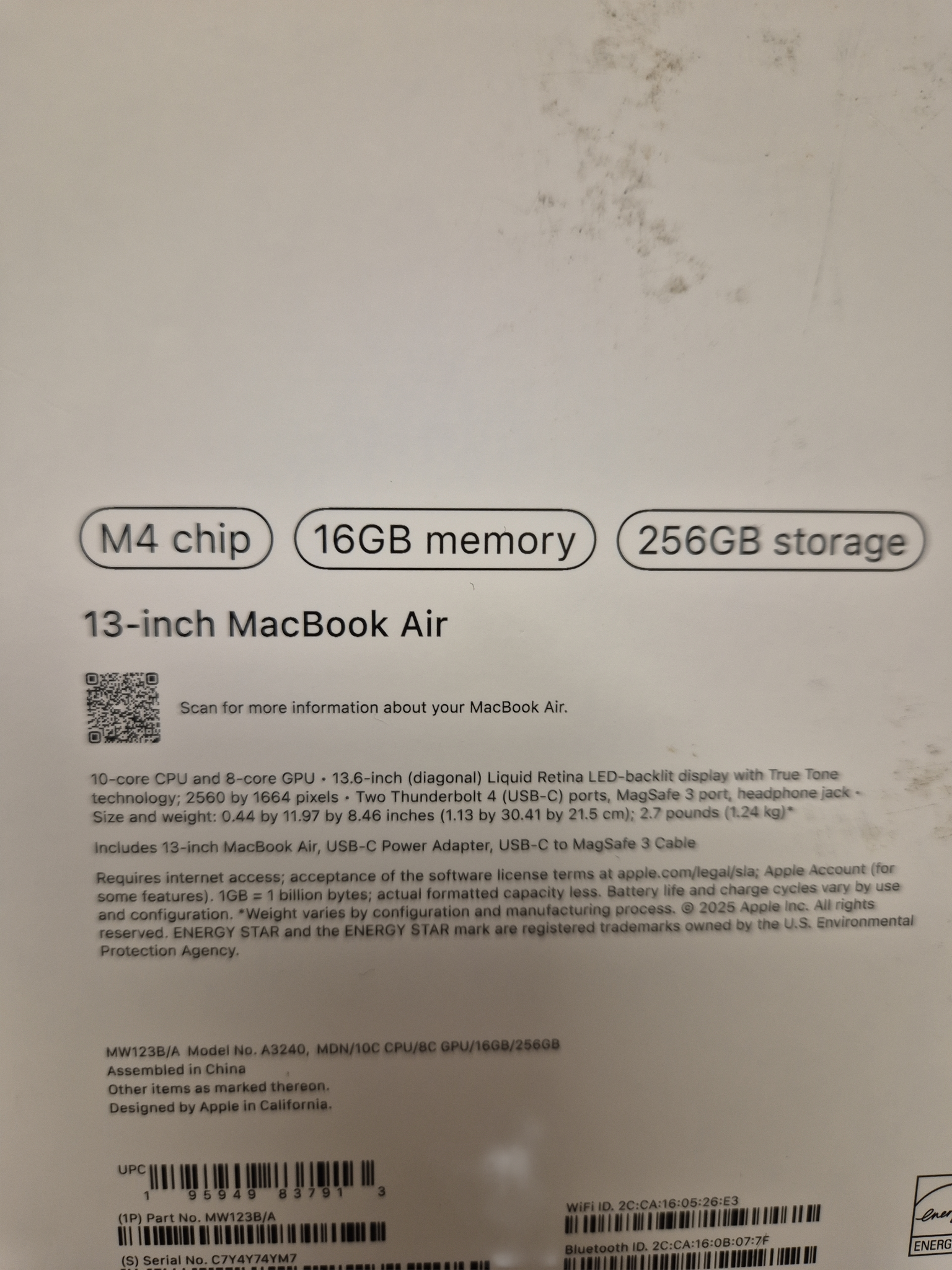 Built for Apple Intelligence MacBook Air is the world's most popular laptop for a reason. Actually, for a lot of reasons. It delivers up to 18 hours of battery life. The M4 chip unlocks a whole new level of performance for work and play. With tens of thousands of apps optimised for Apple silicon, all your favourites run lightning fast in macOS, including Microsoft 365 Copilot, Adobe Creative Cloud and Google Workspace with Gemini. And regular, free macOS software updates keep things running smoothly. Apple Intelligence is built in to help you get things done effortlessly.With the perfectly portable MacBook Air, you'll be ready to take on just about anything, anywhere. Performance and Battery Life The M4 chip in MacBook Air makes graphics and gaming look better than ever. With second-generation hardware-accelerated ray tracing, you get more realistic images for truly immersive gaming. And Dynamic Caching drives a huge performance boost for pro apps and games. So everything you do feels less like work and more like play. Apple silicon combines a powerful CPU, GPU, memory and more on a single chip, making all your apps - from Microsoft 365 Copilot to Adobe Creative Cloud - run faster while requiring less power.