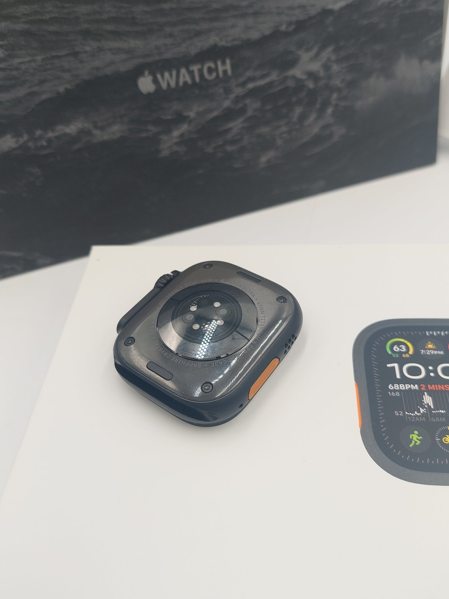 Apple Watch Ultra 2 (Cellular) Black Titanium, 49mm Strap (Black Titanium Sports Band) **GREAT CONDITION, LIKE NEW & BOXED** The Apple Watch Ultra 2 (2023) is a 49mm rugged smartwatch featuring a Grade 5 titanium case, S9 SiP processor, and an always-on LTPO2 OLED display with up to 3,000 nits brightness. Key specs include 64GB storage, 36–72 hour battery life, precision dual-frequency GPS, Action button, and IP6X water/dust resistance