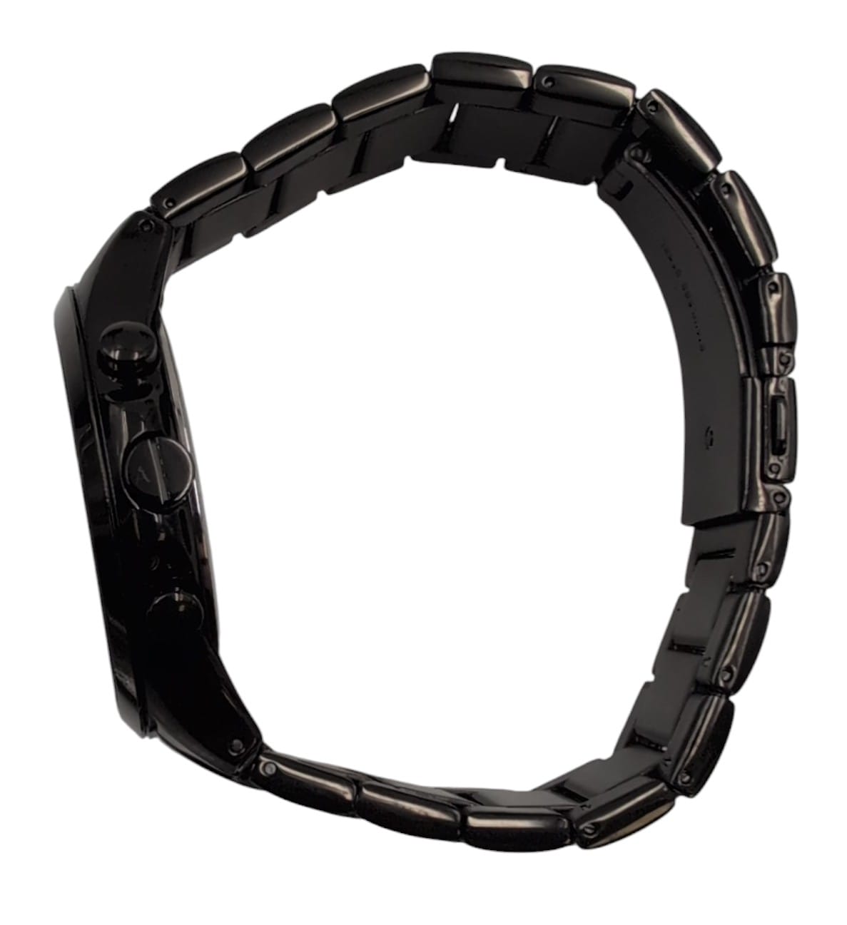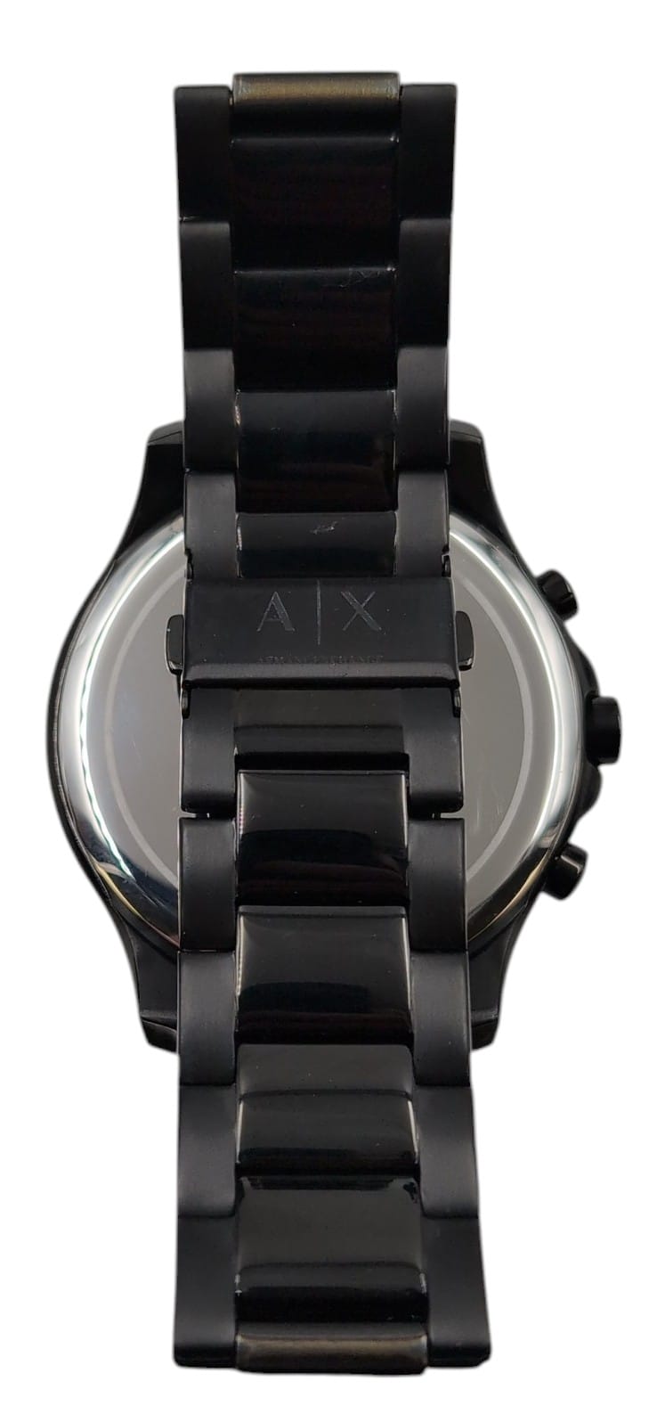 Armani Exchange AX2164 is a stylish 46mm men's chronograph watch featuring a sleek, all-black ion-plated stainless steel design with gold-tone accents. It runs on reliable quartz movement, offers 50-meter water resistance, and includes a date display, making it a versatile, fashionable accessory for daily wear.