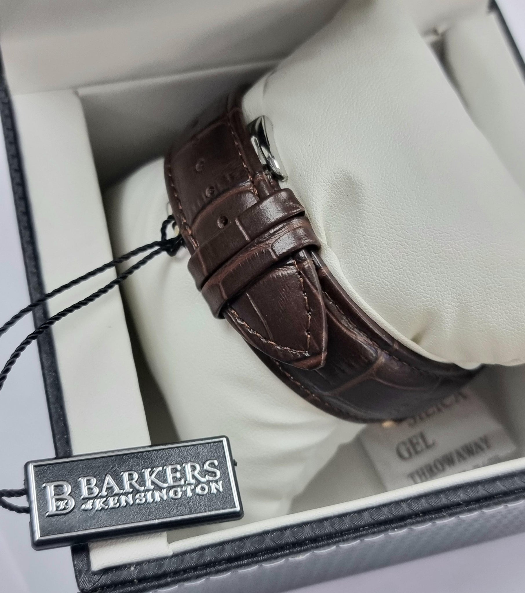 Brand Name BARKERS OF KENSINGTON Model number 1992501305687 Part Number 1992501305687 Model Year 2017 Item Shape Round Dial Window Material Type Crystal Display Type Analog Clasp Type Tang Buckle Case Material Stainless Steel Case Diameter 43.00 Case Thickness 13.3 millimetres Band Material Leather or Suede Band Colour Brown Dial ColourWhite Special Features Calendar Movement Automatic