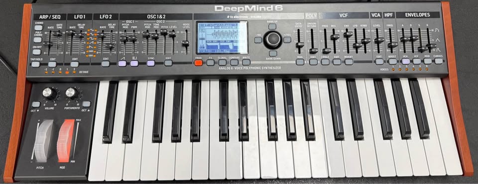 The Behringer DeepMind 6 is a compact, 37-note velocity-sensitive keyboard featuring 6-voice polyphonic analog synthesis, designed for versatility and live performance. It boasts 2 DCOs and 2 LFOs per voice, a 32-step sequencer, 4 FX engines (TC Electronic/Klark Teknik), and a comprehensive 8-bus modulation matrix. Key Features & Technical Specifications: Voices: 6-voice true analog polyphony. Keyboard: 37 semi-weighted, full-size keys with velocity and aftertouch. Sound Engine: 2 DCOs per voice, noise generator, and oscillator sync mode. Filter: Selectable dual-slope analog low-pass filter per voice, plus a global high-pass filter. Modulation: 3 ADSR generators per voice, 8-channel modulation matrix with 19 sources and 130+ destinations. Effects: 4 FX engines featuring over 33 algorithms from TC Electronic, Midas, and Klark Teknik. Sequencer/Arpeggiator: 32-step control sequencer with adjustable slew rate and MIDI sync. Connectivity: USB, MIDI In/Out/Thru, Stereo Output, CV/Pedal input. Control: Wi-Fi, USB, or MIDI for remote control via iPad/PC/Mac apps.