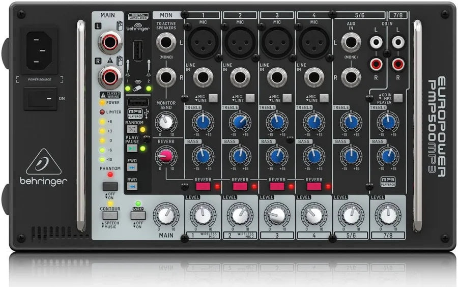 The Behringer PMP500MP3 500W 8-Channel Powered Mixer is a high-quality compact mixer with integrated MP3 player. Channels 1-4 provide you with excellent, premium quality preamps, all with +48V phantom power. This allows you to incorporate high-quality condenser microphones into your performances. You'll be free to sculpt the sound of each source to suit your every want and need thanks to the inclusion of an ultra-musical 2-band EQ. The integrated MP3 player lets users play audio files straight from their USB stick for a seamless performance. A quality reverb control adds an extra element to vocals whilst a voice-over-priority function dims the music when microphones are used so all announcements are crystal clear. This is the ultimate compact vocal package.