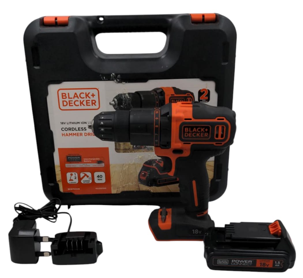 Black and Decker Cordless Hamer Drill, Battery, Power Dock and Hard Case. Is in good condition, does have light scratching and marks. Is in used condition.