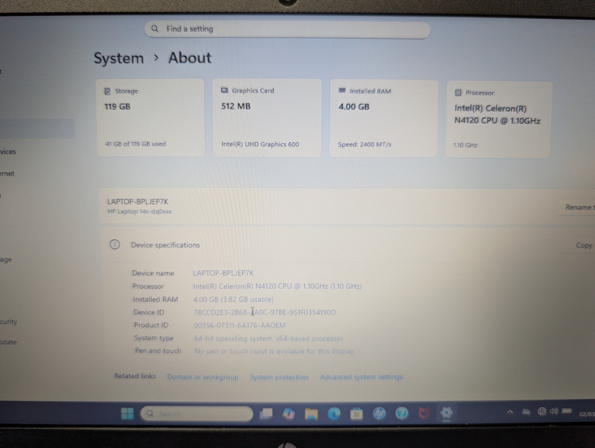 HERE WE HAVE A BLUE HP LAPTOP WITH CHARGER THIS COMES FACTORY RESET AND UNBOXED FEATURING WINDOWS 11,128GB STORAGE,N4120 CPU AND 4GB RAM. ** FOR ANY QUERIES PLEASE CALL OUR PRESTON STORE DIRECT MON-SAT 01772 204899