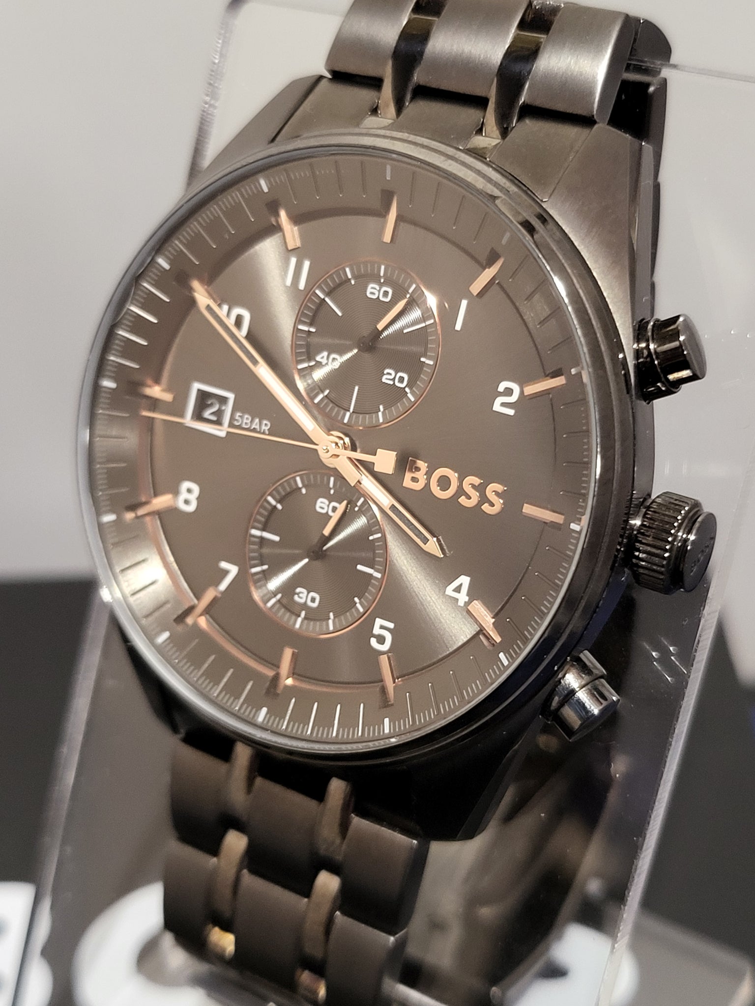 Core Features of a BOSS Watch: Every BOSS watch features mineral glass to protect the dial. Each of the models is water-resistant up to at least 30 metres (3 bar). BOSS watches are all powered by precise and reliable quartz movements. The brand creates watches for both ladies and men in a wide range of styles, ensuring there is a perfect BOSS watch for every collector. Model Specifications 1514153: This watch is part of the men’s SkyTraveller collection. This chronograph features a sleek grey dial with two sub-dials and a date aperture at 9 o’clock. The dial also features a mix of silver-tone Arabic numerals and rose gold-tone baton indices as well as rose gold-tone hour, minute and second hands. A grey stainless steel case frames the dial. The case measures 44mm in diameter. The watch is finished with a grey stainless steel bracelet that fastens with a deployment clasp. The watch is water-resistant up to 50 metres (5 bar). Movement Type - Quartz.
