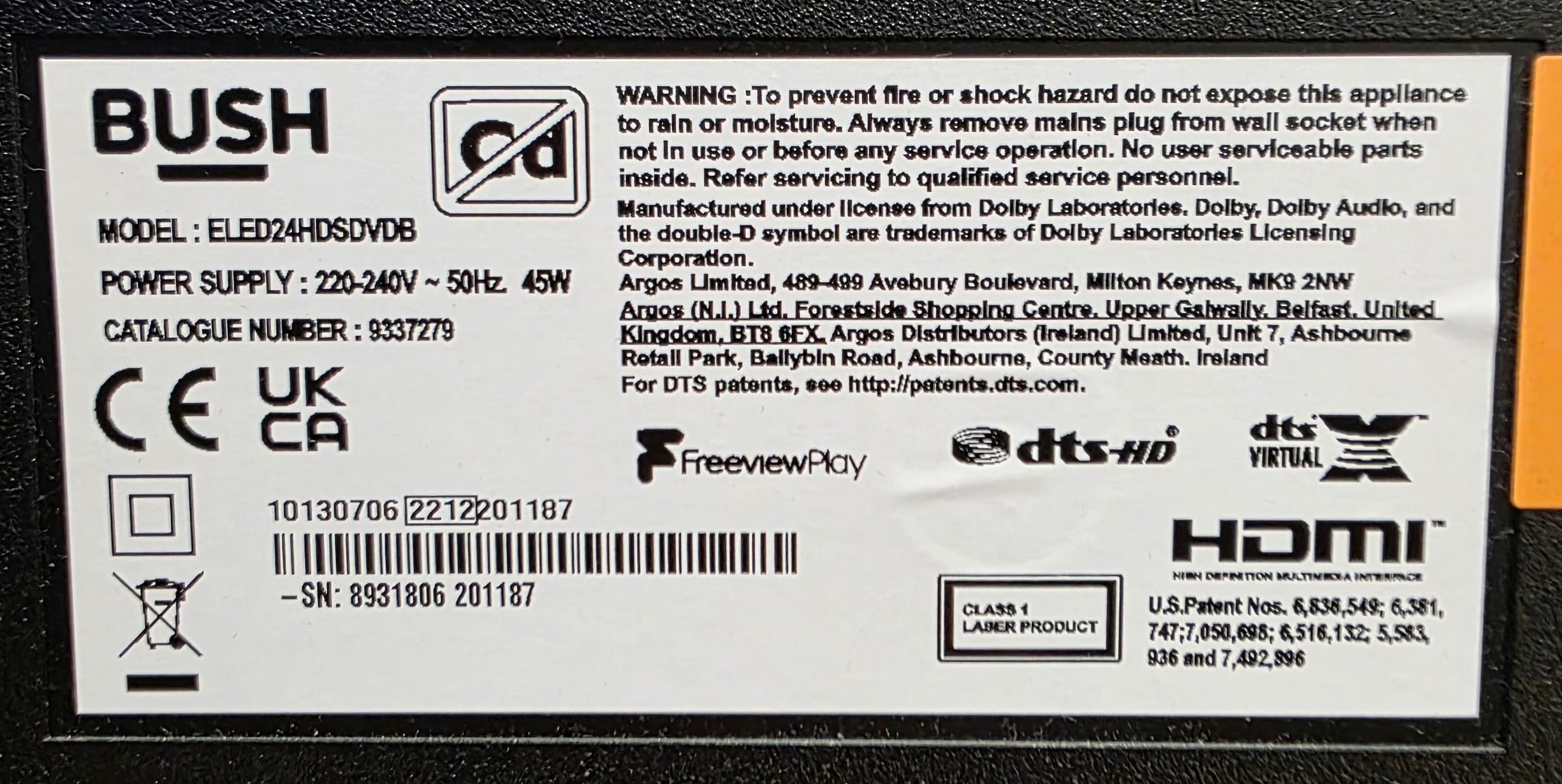 The Bush ELED24HDSDVDB is a 24-inch HD Ready (720p) LED Smart TV/DVD Combi featuring a built-in DVD player, Freeview Play, and HDR10 support. It offers smart functionality including Netflix, YouTube, and browser apps via Wi-Fi/Ethernet. It includes 2 HDMI ports, 1 USB port, and a VESA 75x75mm mount. Display: 24-inch LED, 1366 x 768 (HD Ready) resolution, 16:9 aspect ratio. Smart Features: Built-in Wi-Fi, Ethernet, Freeview Play, Netflix, Amazon Prime, YouTube. Built-in Player: DVD Player. Connectivity: 2x HDMI, 1x USB, 1x VGA, 1x Component, 1x Headphone jack. Audio: Stereo sound, Built-in speakers. Dimensions: H36.5, W55.3, D13.5cm (with stand); H33.4, W55.3, D6.3cm (without stand). Energy Consumption: 22W operational, 27 kWh/year. Mounting: 75 x 75 mm VESA wall mount.