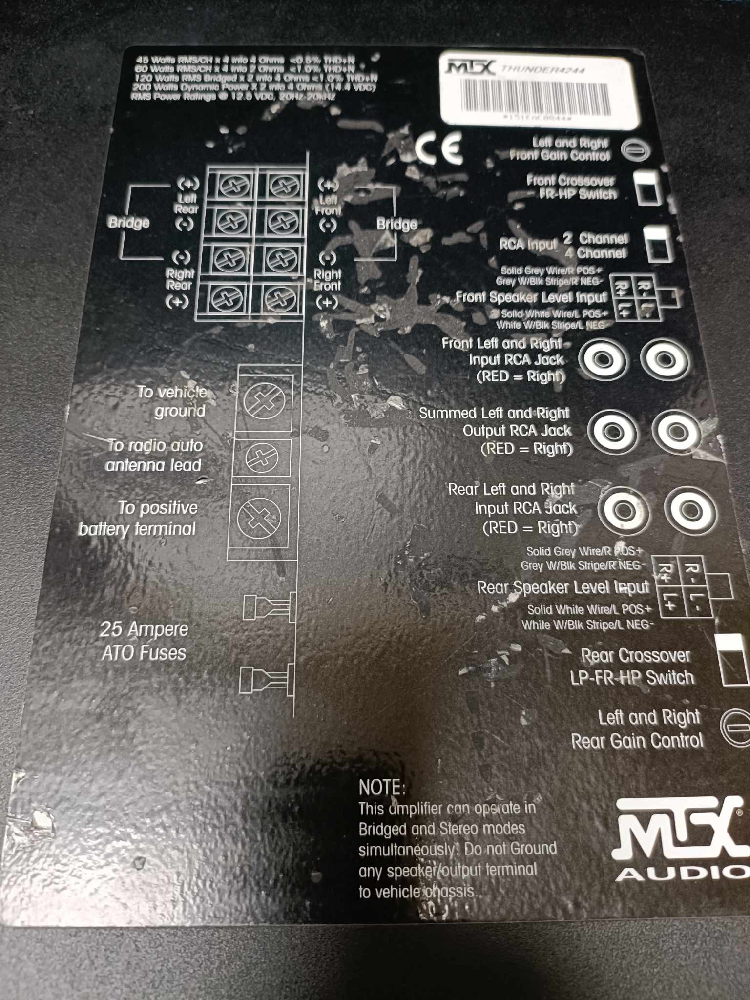 The MTX Thunder4244 4-channel amplifier uses a "pure N-channel" design with a MOSFET power supply for impressive power and outstanding performance. This efficient circuitry turns most of the available energy into usable wattage, rather than the heat generated by most amps. Intelligent Surface Mount Technology gives the amplifier superior resistance to vibration, for long-term reliability. Speaker-level inputs feature SmartEngage, which turns the amp on when it gets signal from the receiver.
