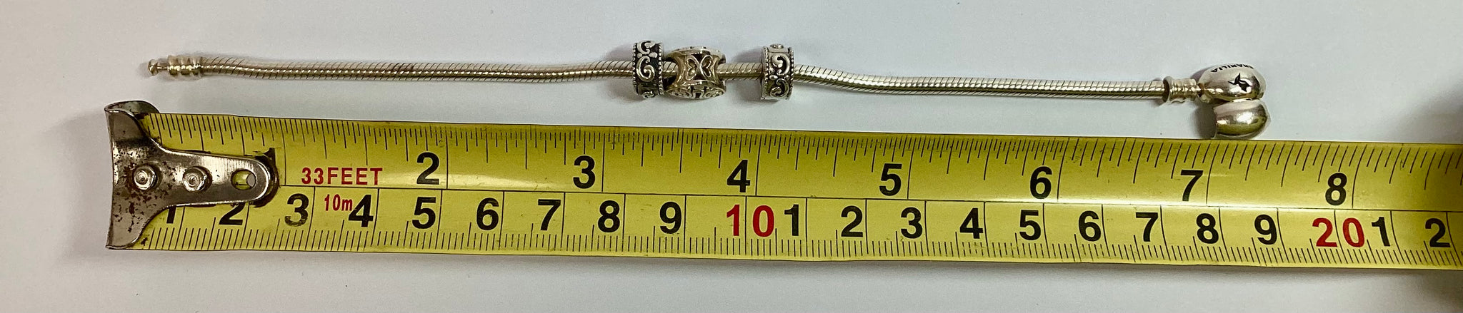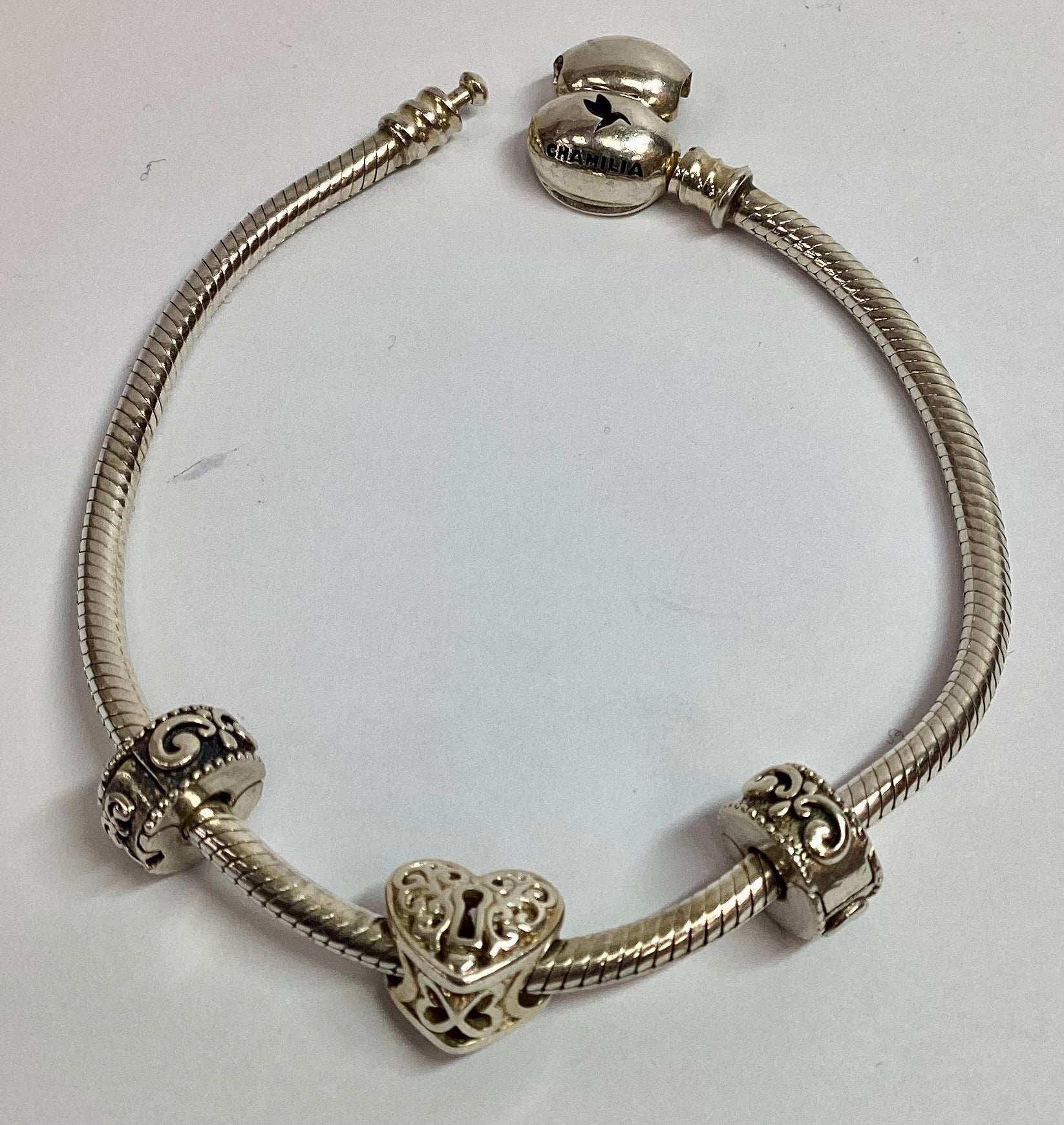 Beautiful chamilia charm bracelet with 3 different charms on sized 7.5-inches