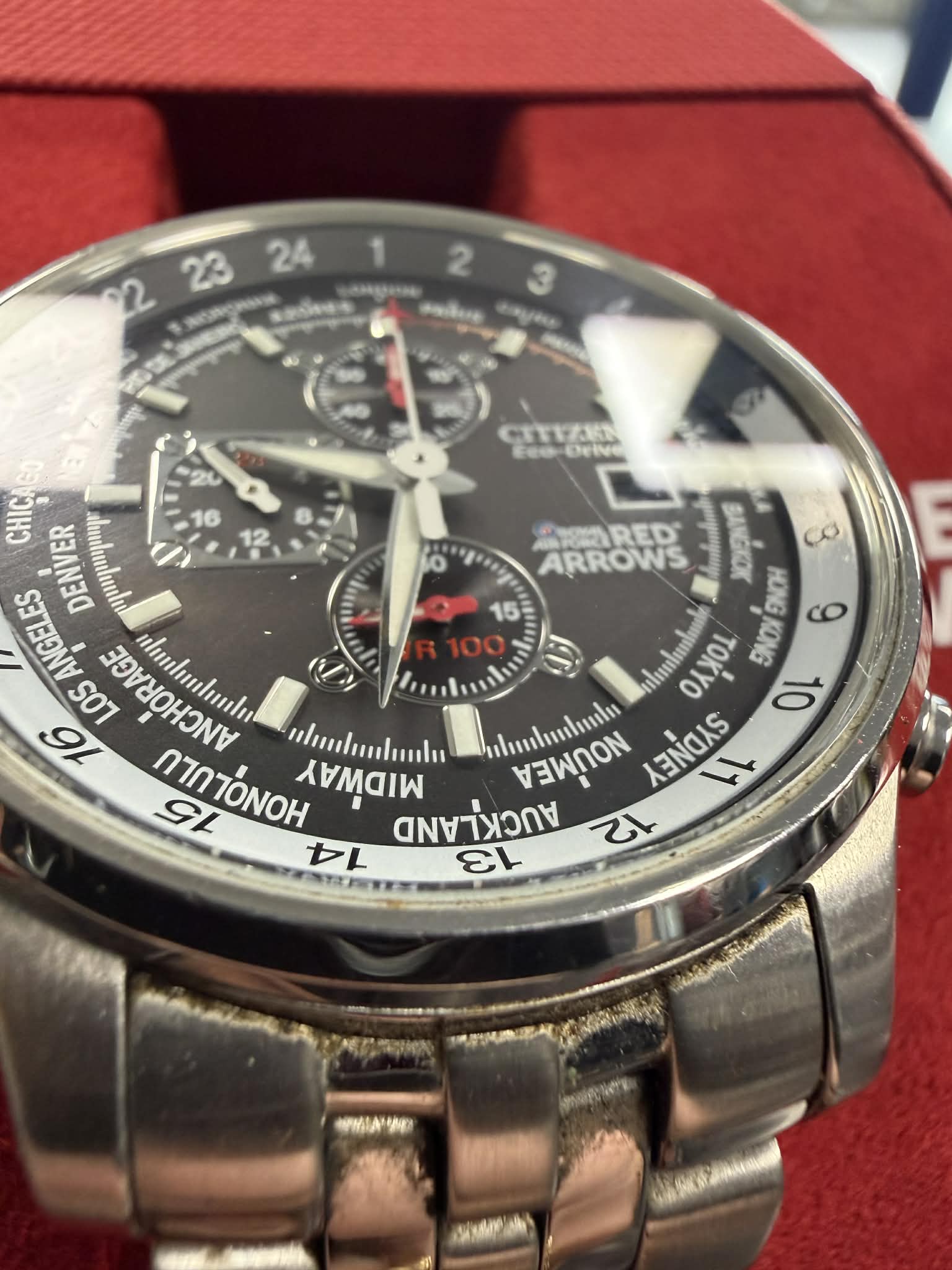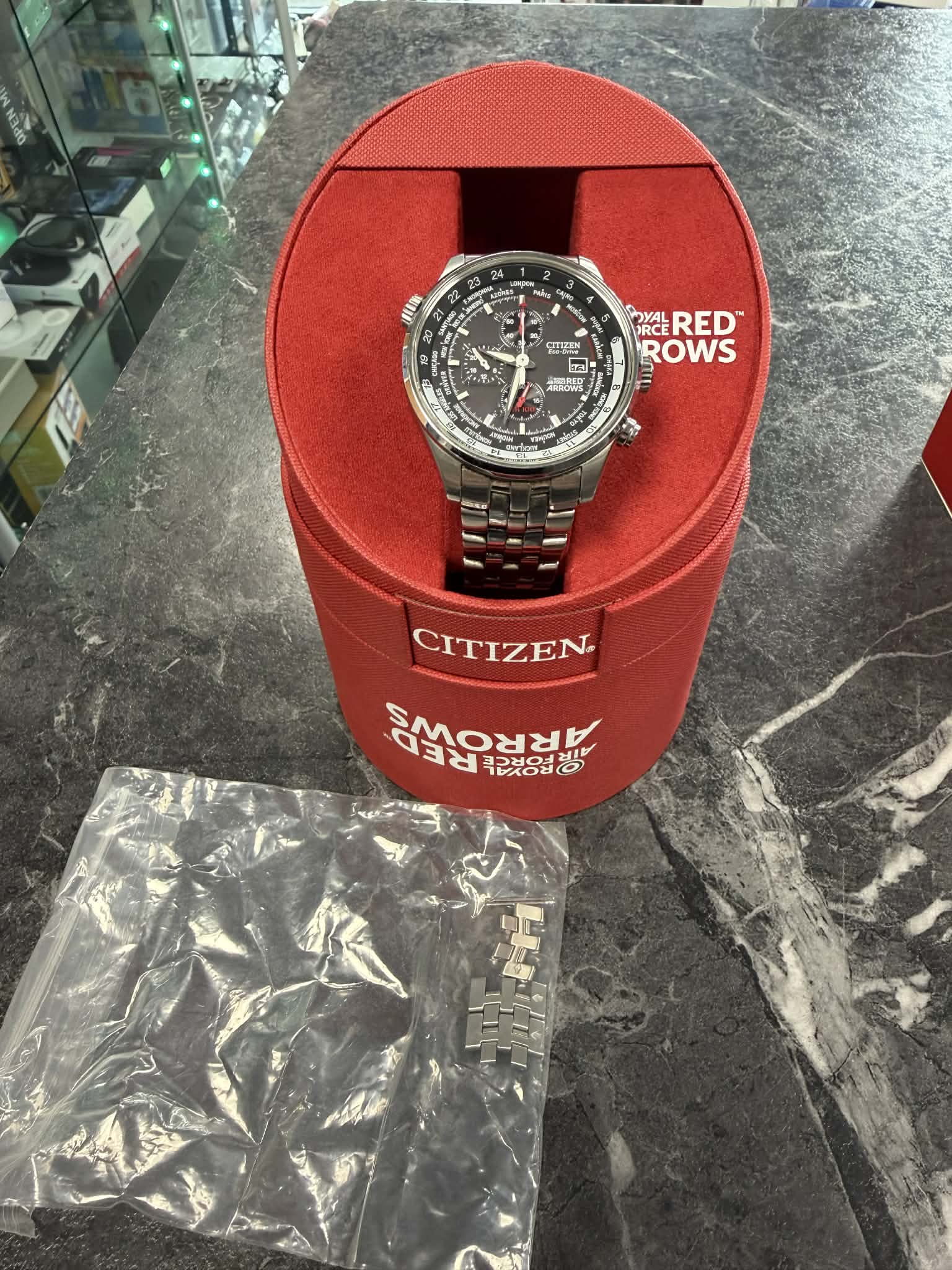 This is a Pre-Owned Citizen Red Arrows GN-4W-S. This is in very good condition with 1 very light scratch on the face which is highlighted in the photos. This watch comes with extra links inside the box and it has the inner box and outer box for extra protection during the delivery! The Limited Edition Citizen Red Arrows Eco Drive Chronograph Watch is a stylish and high-quality timepiece perfect for aviation enthusiasts. Featuring a black dial with baton indexes, this round watch has a silver stainless steel case with a polished finish. The watch is equipped with a left-handed chronograph movement and is water-resistant up to 100 metres. It comes with the original box and papers, making it a reliable and fashionable choice for men looking for a unique and stylish wristwatch. Free UK Delivery Any item over £50 will be sent out Royal Mail Special Delivery or Fedex (depending on size and weight of package) for next working day delivery Any items under £50 will be sent out by Royal Mail 2nd Class for delivery between 3 and 5 working days All orders made before 11AM will be sent out the same working day Please note that deliveries to Ireland, Highland of Scotland and the Isles may take longer to arrive.