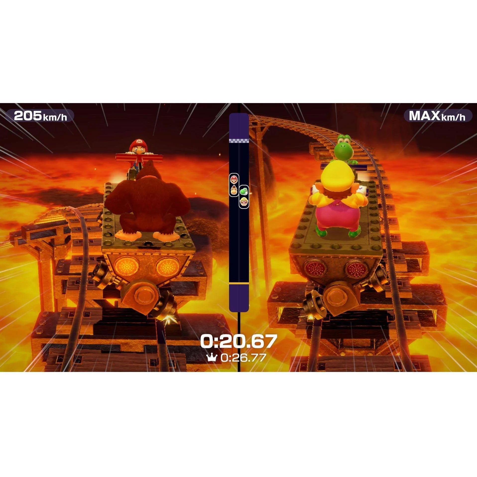 Superstars listen up. Experience five classic Nintendo 64-era game boards and 100 mini-games from across the series in Mario Party Superstars for Nintendo Switch. Mario Party is back with five classic Nintendo 64 game boards from the Mario Party series. On Peach's birthday cake from the original Mario Party game, racing to get the most stars (and sabotaging your opponents) becomes a sugary affair. In Space-Land, keep an eye on the countdown to avoid getting hit by Bowser's coin beam and losing coins. In Mario Party, the tide can turn quickly, so party-goers better be on their guard. This and other modes can also be played online. Throw yourself into a superstar collection of mini-games from the Mario Party series. Whether you're collecting coins for stars in Board Game mode or just practicing a bit in Free Choice mode, a win in Mushroom Jumble or Flag Jumble feels terrific either way. All minigames are played with button controls, so you can get into the party spirit with Joy-Con controllers, Nintendo Switch Pro controllers, or Nintendo Switch Lite. Whether you're playing on the same console, locally or online, the party fun knows no bounds. Board game matches with friends are saved after each round, so you can take a break at any time and then pick up where you left off. As you chase stars, you can motivate or tickle your teammates with stickers. All game modes support online multiplayer, whether you want to play a few short mini-games with friends or compete in a 30-round marathon. Victory against global opponents has rarely tasted sweeter.