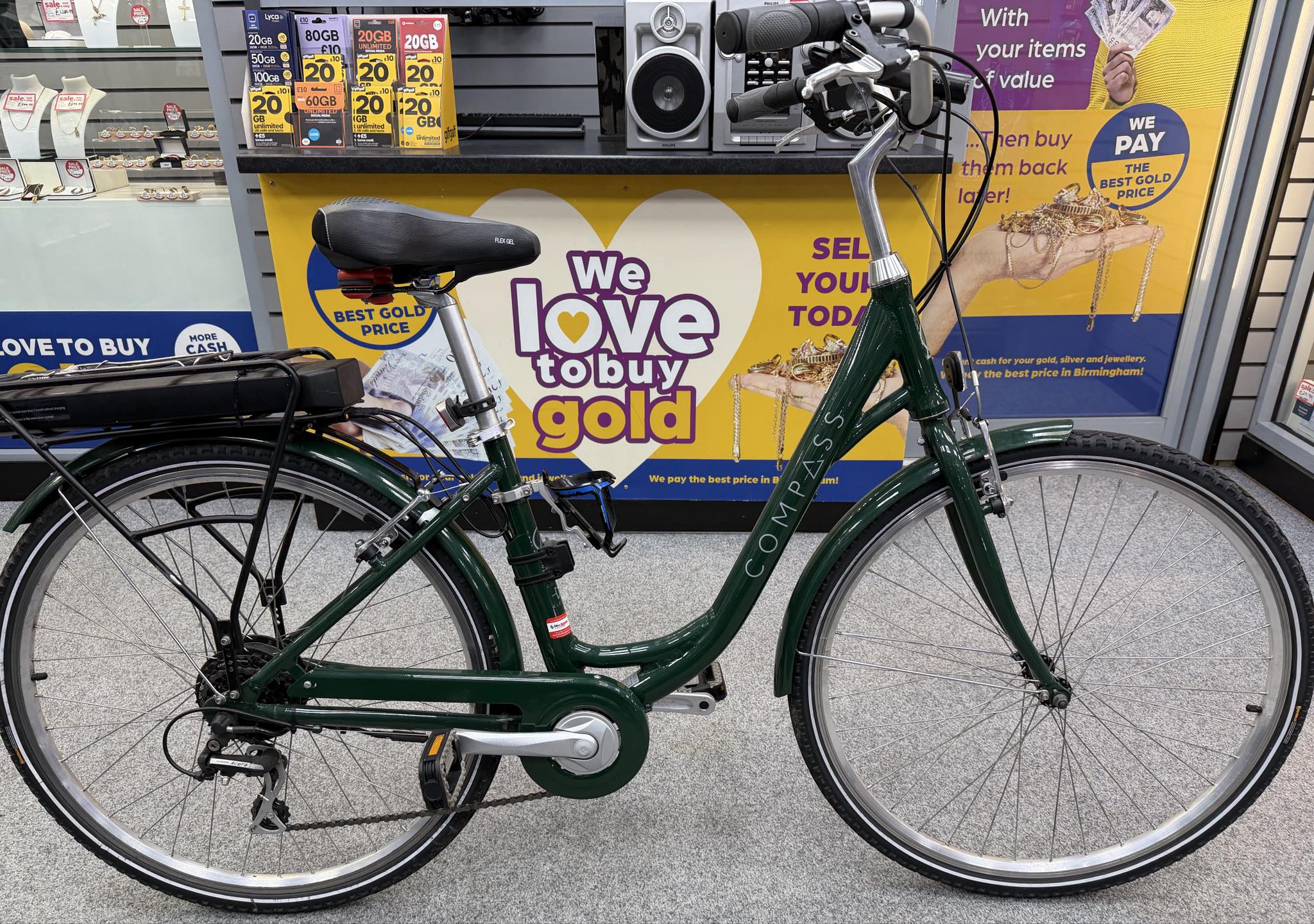 The Compass electric power assisted bike combines modern design, dependable performance, and everyday comfort. Whether you’re commuting to work, cruising through the city, or enjoying longer leisure rides, this e-bike makes every journey smoother and more enjoyable. Its powerful electric assist motor provides natural, responsive support while pedaling, helping you tackle hills, headwinds, and longer distances with confidence. The long-lasting battery delivers reliable range, so you can focus on the ride instead of worrying about recharging. Built with a sturdy frame, comfortable riding position, and reliable braking system, the Compass e-bike offers safety and control in all conditions. Easy-to-use controls make it suitable for both first-time e-bike riders and experienced cyclists. Key Features: Electric pedal assist for effortless riding Powerful motor with a durable battery Comfortable riding position for daily use Strong, modern frame design Ideal for commuting and leisure rides The Compass electric power assisted bike is the perfect balance of performance, comfort, and sustainable transportation. The compass bike comes with a charger. ** Collection Only ** **Click and Collect from the Handsworth Branch**
