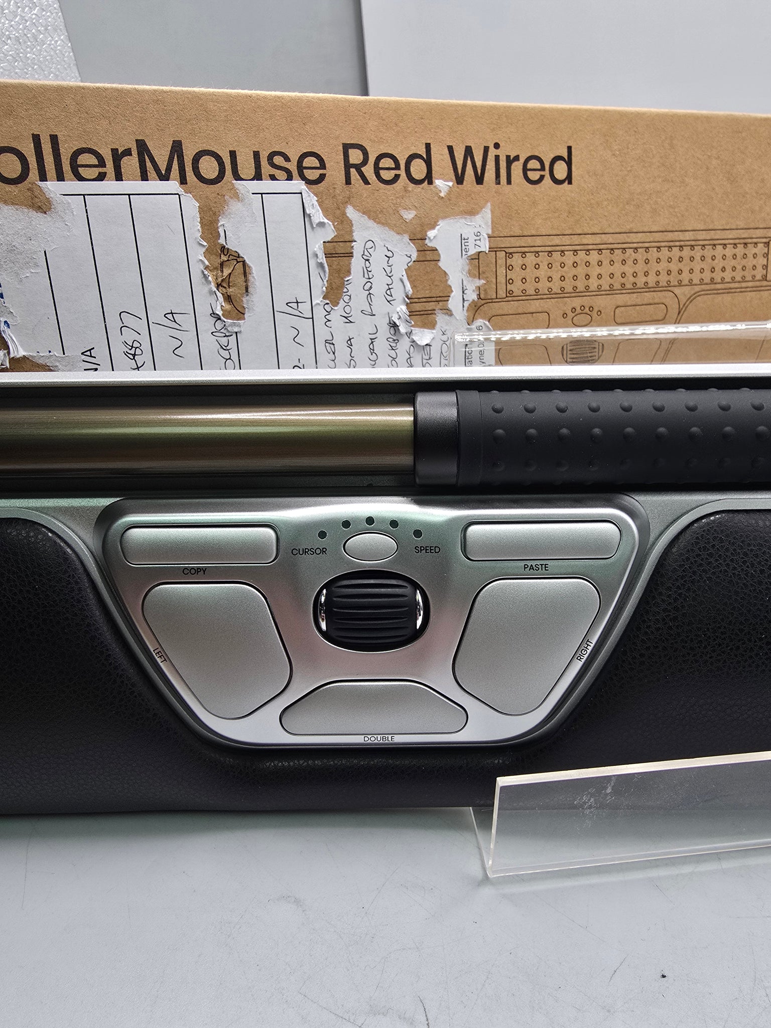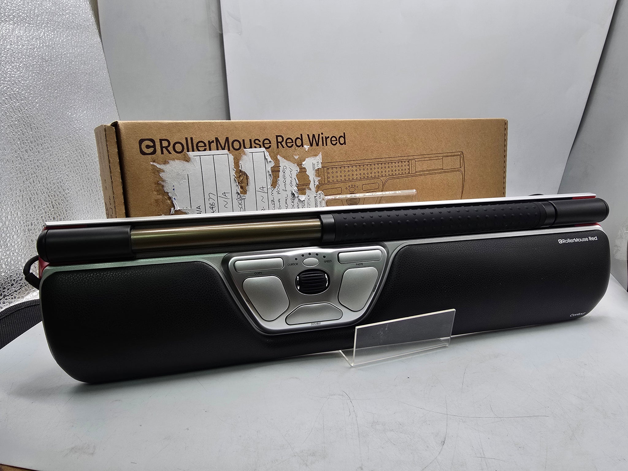 Ergonomic, centered computer mouse that relieves your shoulder, arm, and wrist while you work. The high-precision rollerbar and adjustable cursor speed ensure precise and efficient navigation. The narrow wrist rest made of vegan leather and memory foam features an antibacterial surface and high resistance to disinfectants to ensure optimal hygiene. Made from 59% pre-consumer recycled aluminum. The RollerMouse Red is a high-quality, ergonomic, centered mouse made of aluminum with a wide, grooved rollerbar and a scroll wheel for improved control. It is designed for all the functions you can use on a computer today, as well as for all screen sizes. The rollerbar is positioned in front of the body, allowing for mouse work with minimal stretching, and the centered working position protects against back, neck, and shoulder pain throughout the day. The narrow wrist rest is ideal for smaller hands and compact workspaces. The integrated copy and paste buttons make it easy to quickly transfer text or images between programs, and if you have other frequently used keyboard shortcuts, the buttons can be customized accordingly. Additionally, recycled materials were used in the production of the RollerMouse Red. boxed, good condition