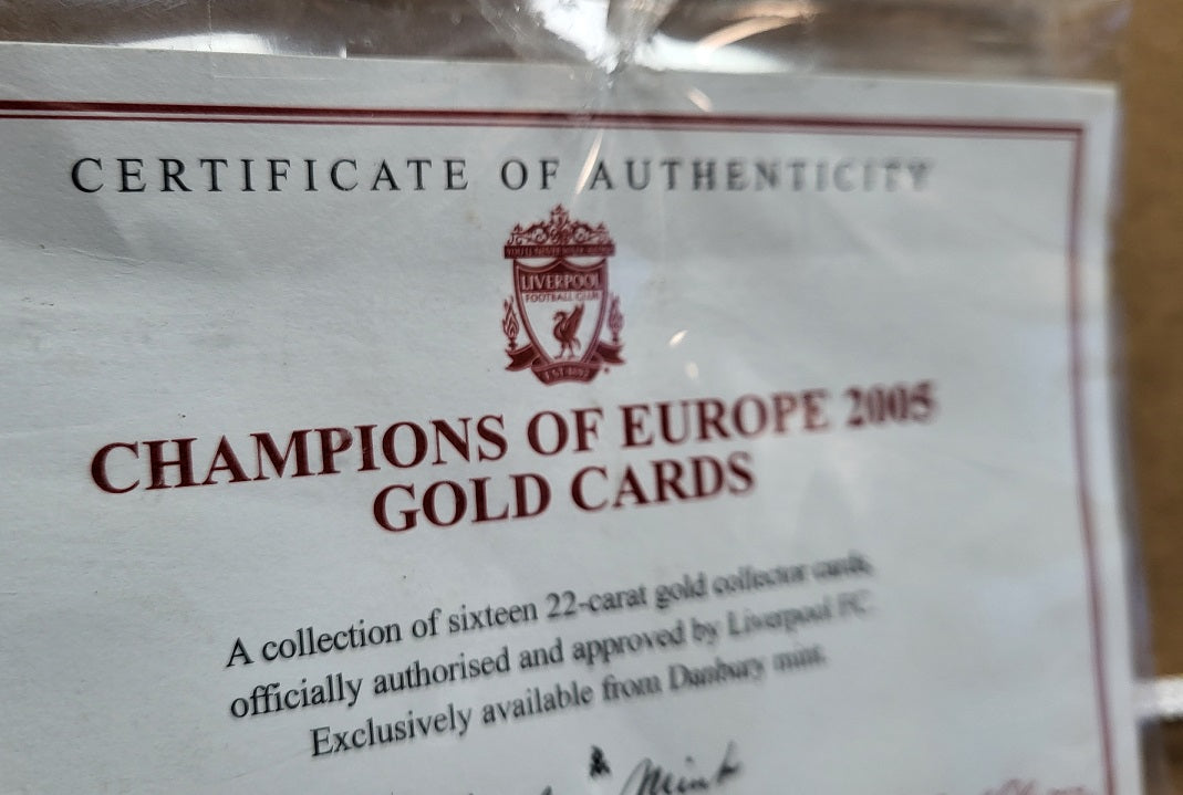 The Danbury Mint Liverpool FC Champions of Europe 2005 22ct Gold Card Collection is a premium piece of memorabilia commemorating the "Miracle of Istanbul," where Liverpool overcame a 3-0 deficit to defeat AC Milan.