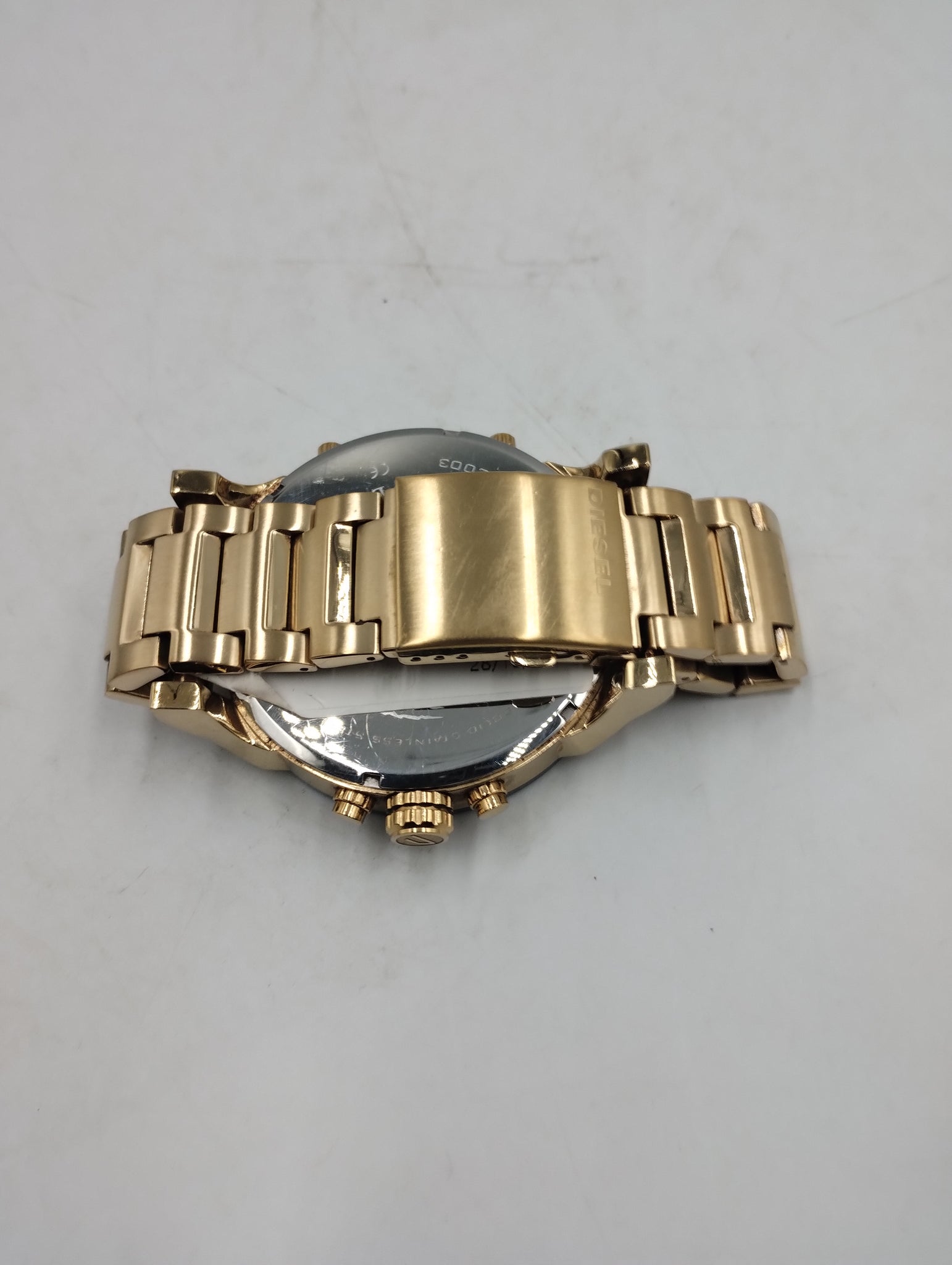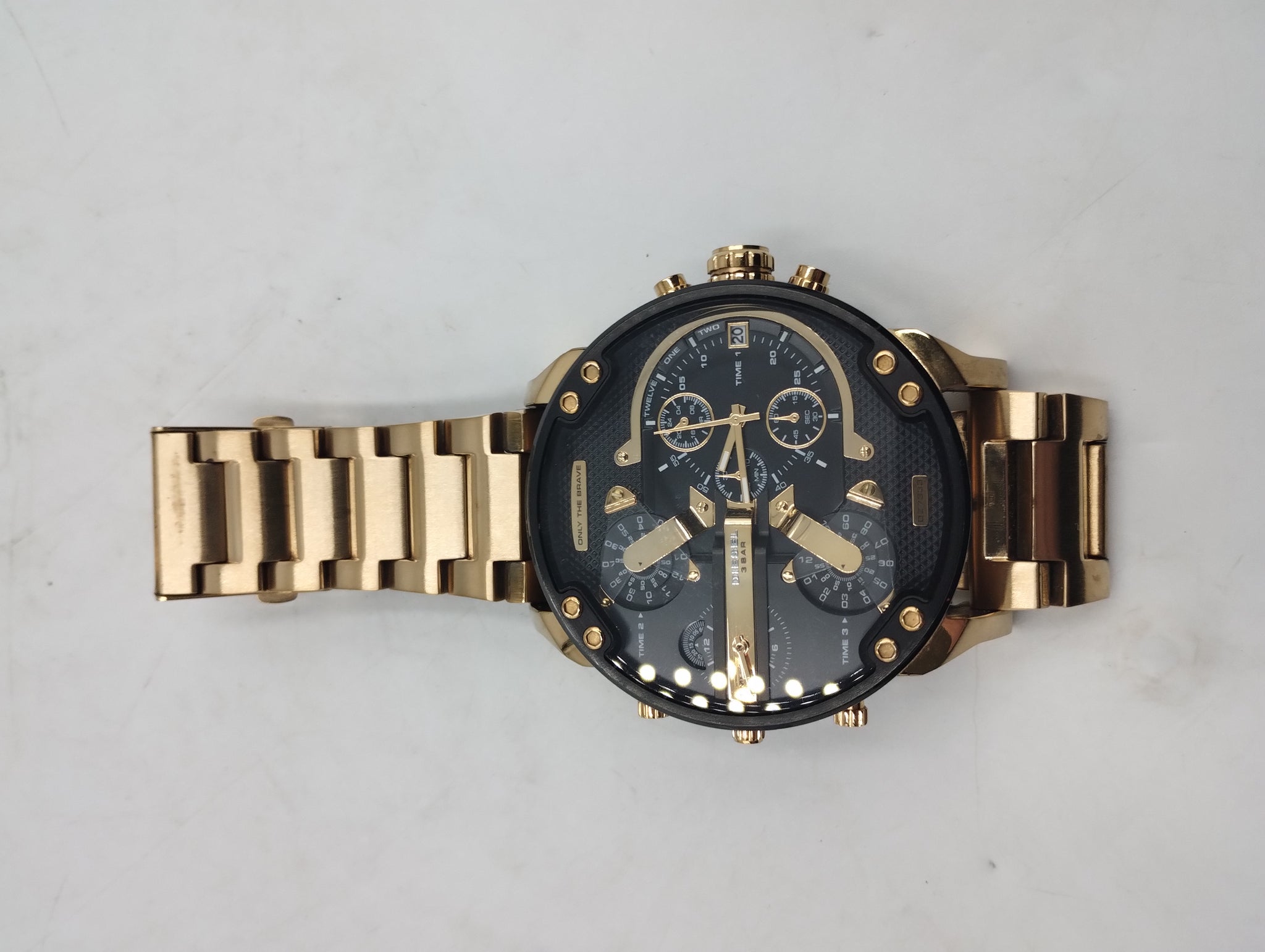 Introducing the Mr Daddy 2.0 DZ7333, a remarkable analog watch designed for gentlemen who appreciate style and sophistication. Crafted by the renowned brand Diesel, this timepiece exudes a sense of luxury with its golden brand color and stainless steel material. The Mr Daddy 2.0 DZ7333 belongs to the series of watches known for their exceptional quality and design. Its round shape and black dial color add a touch of elegance, making it a perfect accessory for any occasion. With a watch case diameter of 66 mm and a thickness of 14 mm, this timepiece demands attention and makes a bold statement on your wrist. The golden watch case color further enhances its allure, creating a captivating visual appeal. Featuring an analog time indication and a quartz movement type, the Mr Daddy 2.0 DZ7333 ensures precise and reliable timekeeping. The watch material glass is made of mineral, providing durability and protection against scratches. Designed to withstand everyday activities, this watch is water-resistant up to 3 ATM or 3 bar. Whether you're caught in a sudden rain shower or simply washing your hands, you can trust that your Mr Daddy 2.0 DZ7333 will remain unaffected. Elevate your style and make a statement with the Mr Daddy 2.0 DZ7333. Embrace the sophistication and elegance that Diesel brings to the world of fashion. UNBOXED IN GOOD CONDITION