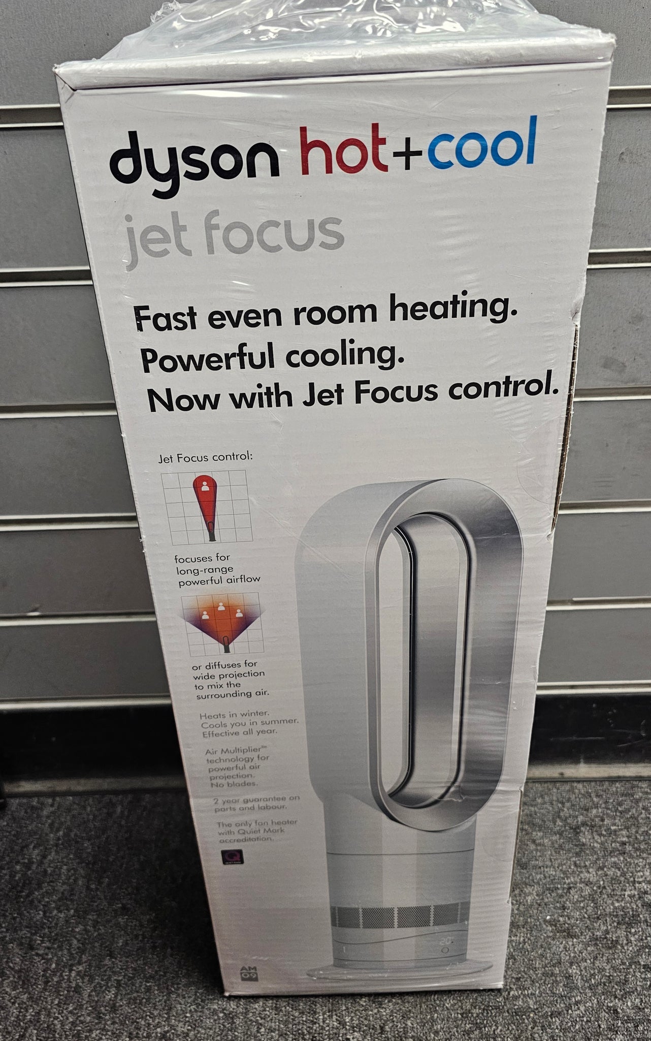 Product information This Dyson Hot+Cool Jet Focus uses Air Multiplier technology which means no spinning blades and no choppy air, just a smooth, cool airflow. It's just like standing on a clear mountain top without the danger. Fancy more of a tropical vibe? No problem. It doesn't just cool you down, it also throws out warm air to get your room to the perfect temperature in no time. And if you're the set it and forget it type, you'll love the sleep timer feature. Just set it to switch off anytime from 15 minutes to 9 hours - no need to stir from your cosy blanket nest. Good to know - Its smooth oscillation directs airflow all around your room keeping it cool and comfortable - There's no visible heating elements and it shuts off automatically if it gets knocked over so it's nice and safe - Easily control the temperature with the included remote control - It's easy to keep clean as there's no awkward safety grill or blades - just wipe with a cloth