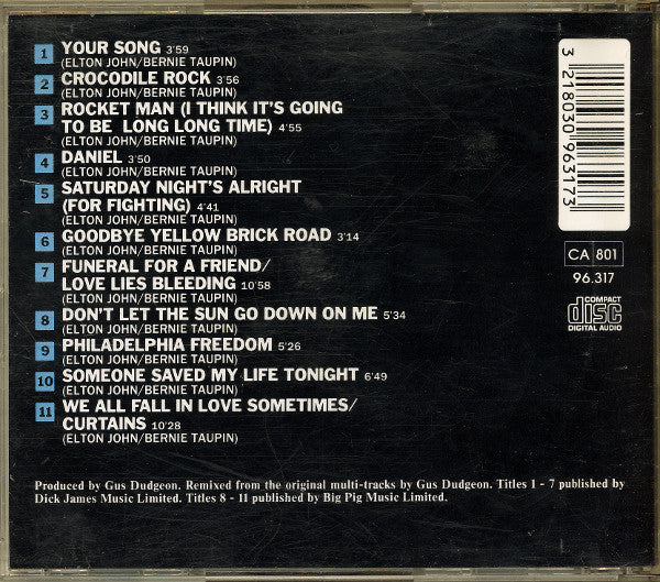 1 Your Song 3:59 2 Crocodile Rock 3:56 3 Rocket Man (I Think It's Going To Be A Long Time) 4:37 4 Daniel 3:50 5 Saturday Night's Alright (For Fighting) 4:42 6 Goodbye Yellow Brick Road 3:14 7 Funeral For A Friend / Love Lies Bleeding 10:59 8 Don't Let The Sun Go Down On Me 5:34 9 Philadelphia Freedom 5:27 10 Someone Saved My Life Tonight 6:49 11 We All Fall In Love Sometimes / Curtains 10:28