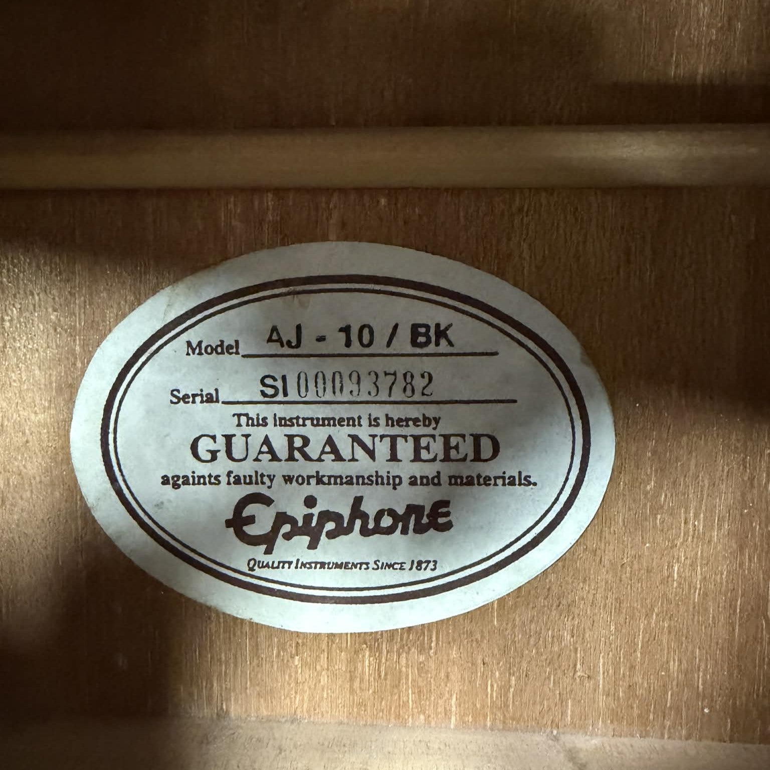 Epiphone AJ 10 / BK Black Acoustic Guitar This has been fully tested and is in good working order. This is a pre-owned item and does have quite a few marks/scratches etc however these do not affect the performance. This does not come boxed or with a case however it will be very well wrapped for delivery! Free UK Delivery Any item over £50 will be sent out Royal Mail Special Delivery or Fedex (depending on size and weight of package) for next working day delivery Any items under £50 will be sent out by Royal Mail 2nd Class for delivery between 3 and 5 working days All orders made before 11AM will be sent out the same working day Please note that deliveries to Ireland, Highland of Scotland and the Isles may take longer to arrive.