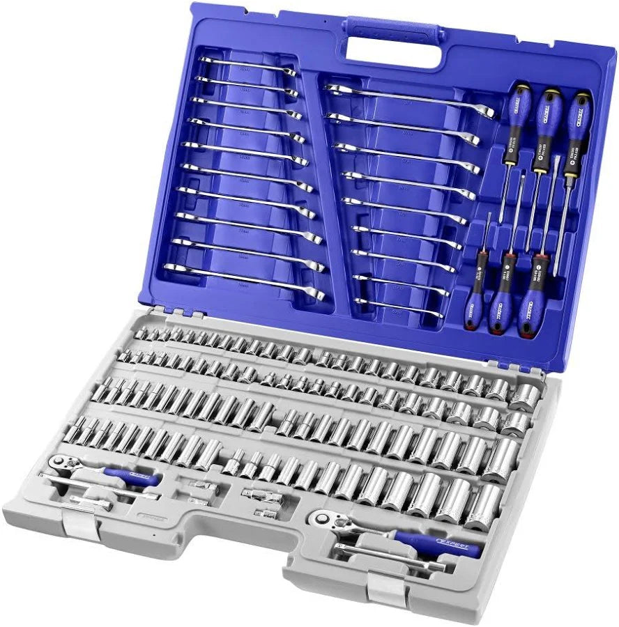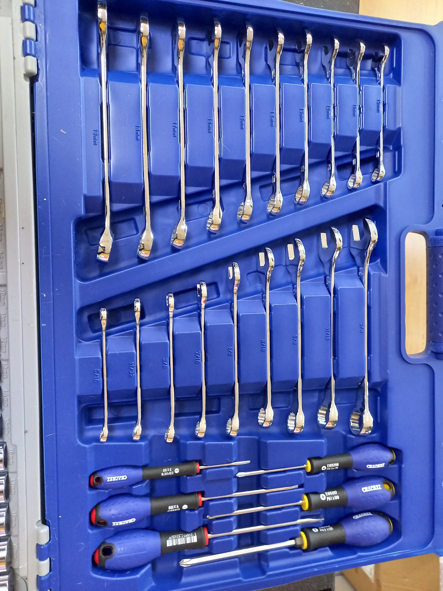 Contains metric and imperial 1/4" and 3/8" square drive hex sockets, as well as combinations spanners, screwdrivers and accessories.1/4" and 3/8" ratchets included.Tooling made from steel.Supplied in a hard plastic socket set case, which can also convert into a modular storage system for use in roller cabinets.