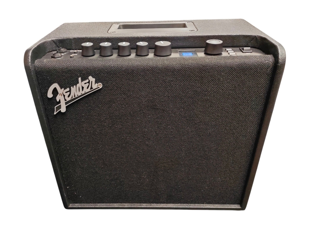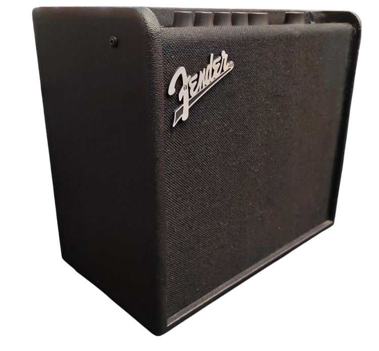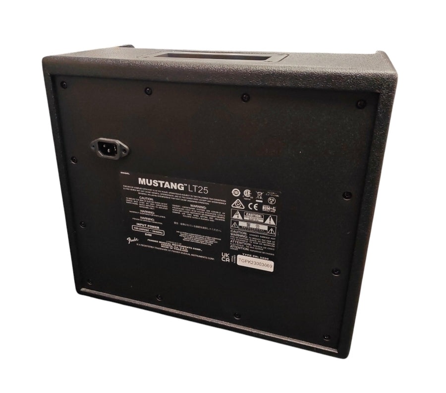 The Fender Mustang LT25 is a 25-watt digital modelling combo amplifier designed primarily for beginners and home practice. It features a simple user interface with a 1.8" colour display and comes pre-loaded with 30 presets that cover a "greatest hits" of electric guitar tones. ower Output: 25 Watts through a single 8" Fender Special Design speaker. Onboard Processing: 20 amp models, 25 effects, and a total of 50 preset slots (30 factory-loaded, 20 user-accessible). Connectivity: 1/4" instrument input, 1/8" stereo auxiliary input for jamming with tracks, and a 1/8" stereo headphone jack for silent practice. USB Port: Supports recording directly into a DAW and firmware updates. Physical Build: Features a sturdy wooden cabinet with a black textured vinyl covering and an integrated recessed handle for portability.