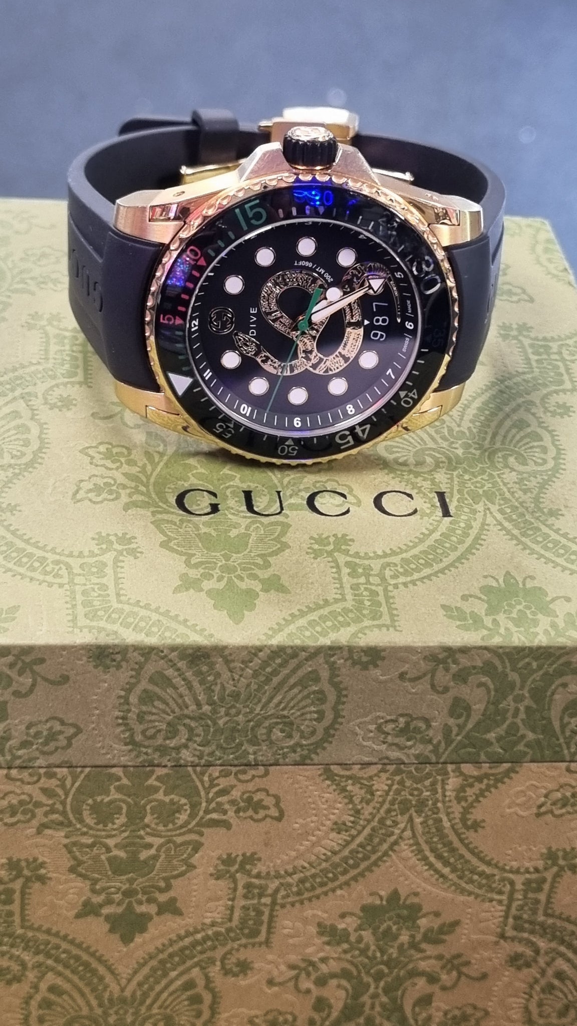 Gucci Dive Quartz Black Dial Black Rubber Strap Watch For Men ***This Gucci watch is in good condition, fully functional, comes with box, no manual included. Silicone thick strap with a unique snake design on the face. ***For any queries please call our Chorley store direct from Mon-Sat on 01257 752333.