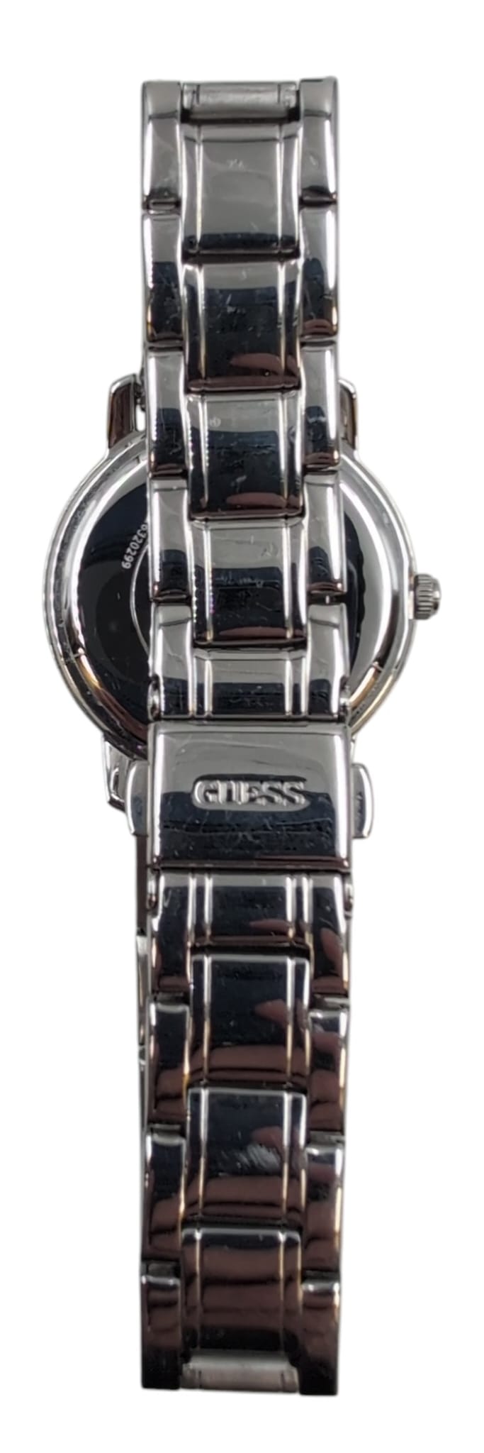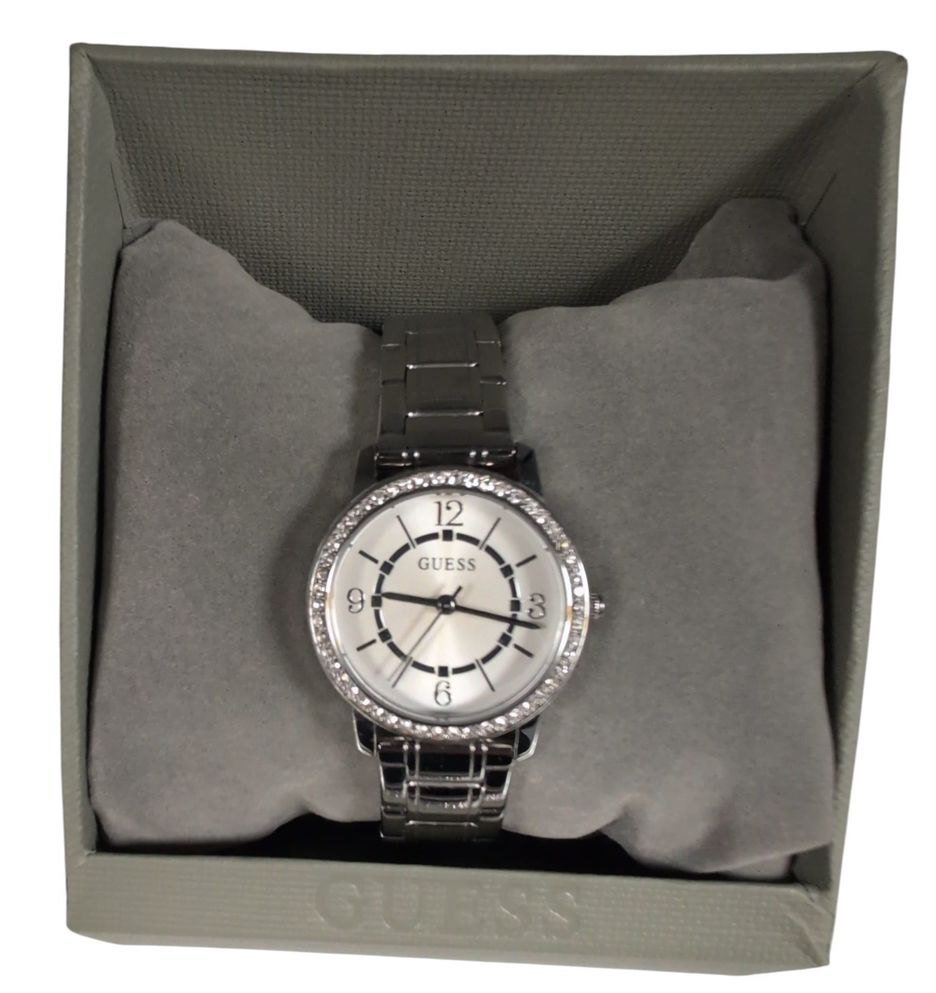 A understated watch from GUESS with a petite, 28mm stainless steel case, a clear silver dial with silver tone dial accents, plus a stunning crystal set bezel which really elevates the design. Fitted with a slim steel bracelet. Presented in an official GUESS box. 50m water resistant.