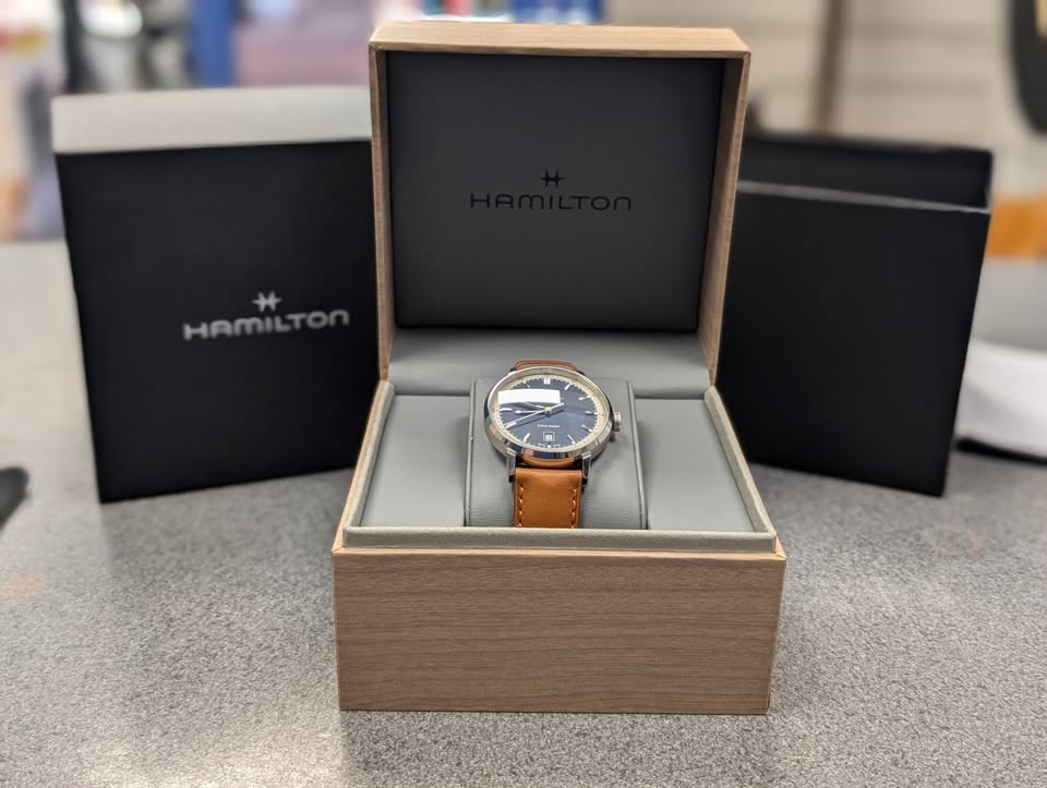 38mm "Intra-Matic" Hamilton Watch with Deep Blue face and tan strap. Great condition.
