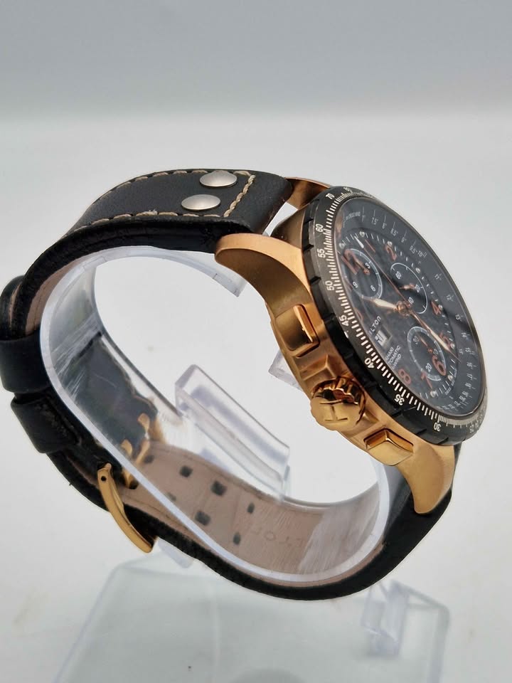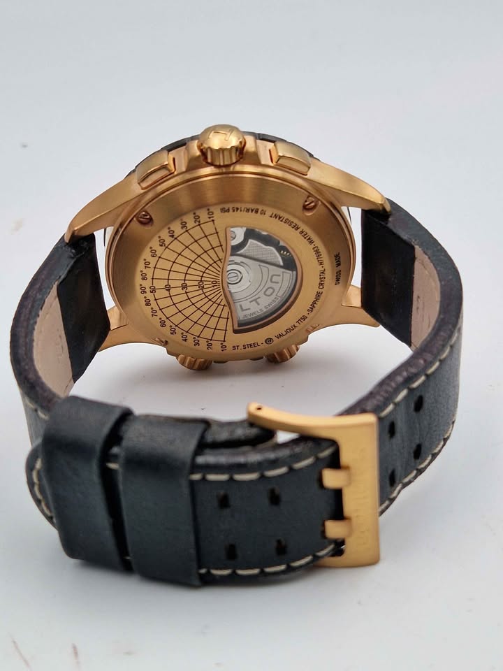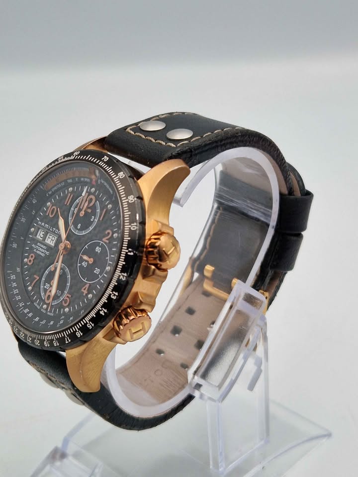 This aviation-inspired men's chronograph watch from the Khaki collection by Hamilton is packed with function and style. From the reverse crown to the airspeed indicator and cross-wind scale on the black dial, the 44mm rose-gold-tone PVD-finish stainless steel case presents the user with a day-date window, luminous indices and hands and distinctive chronograph dials that are both elegant and easy-to-read. The automatic movement is protected by a sapphire crystal and visible through the transparent case back. A black leather strap secures the watch, which is water-resistant to 100 meters.