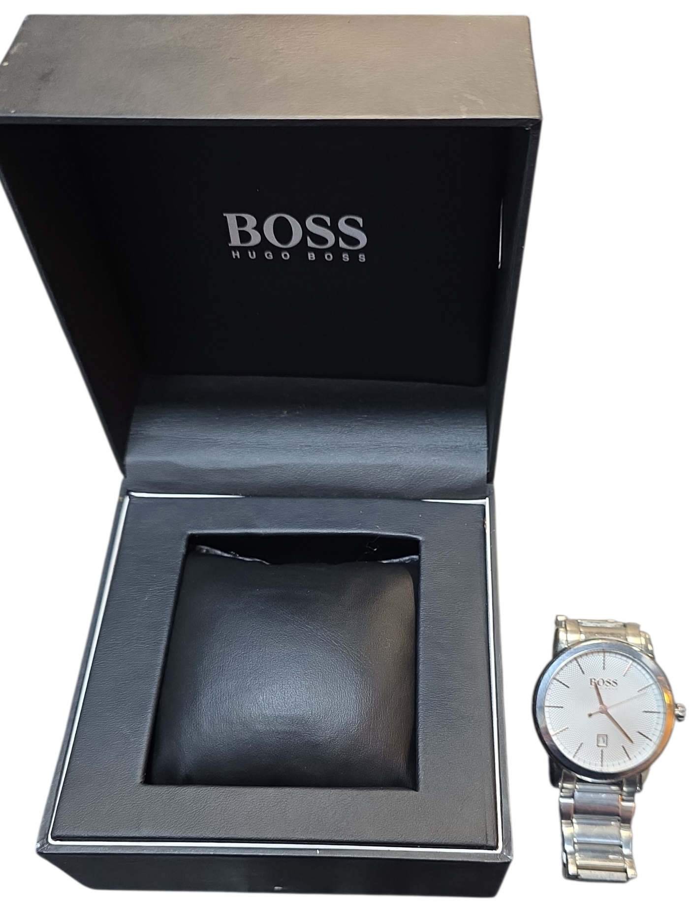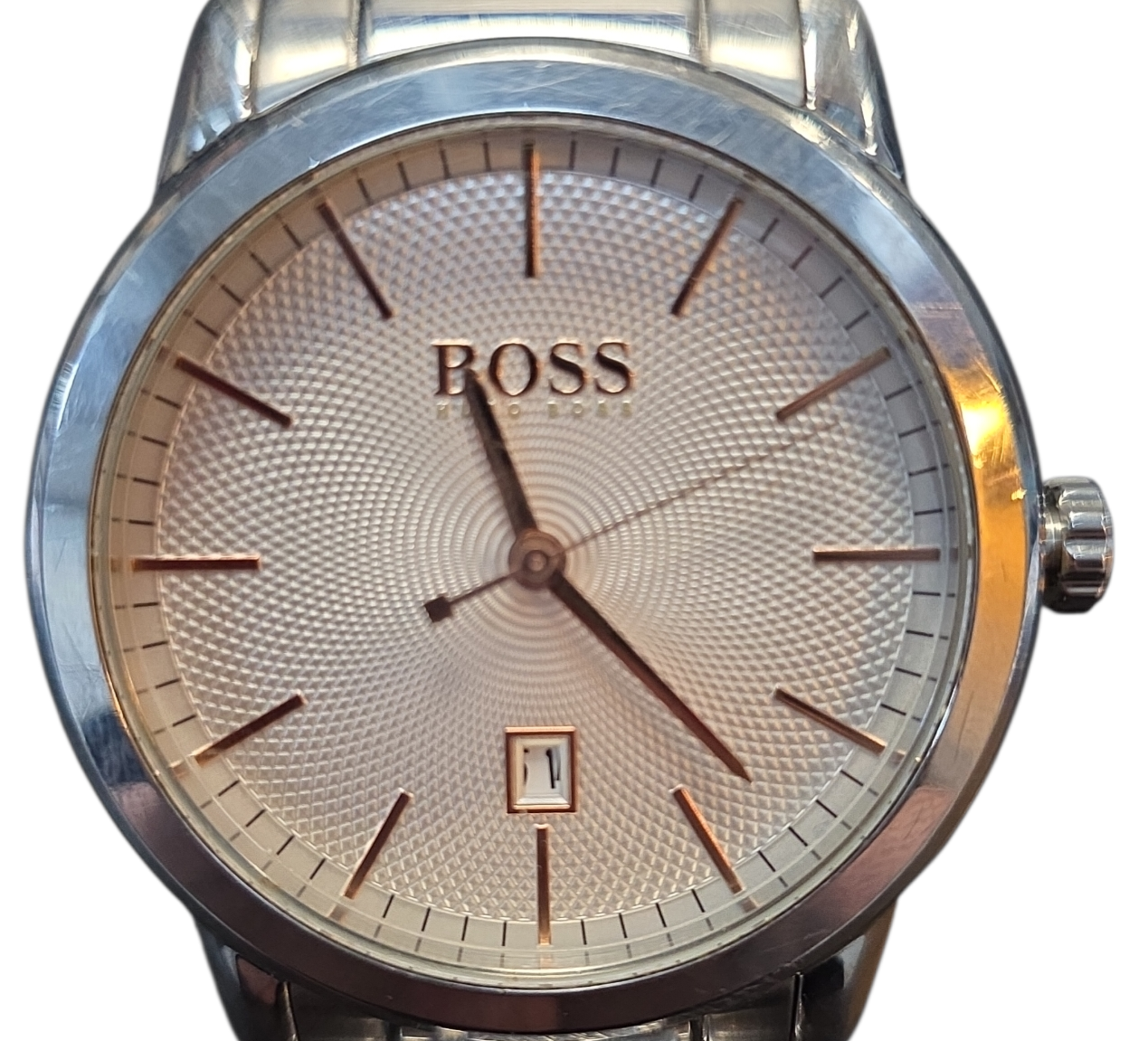 Hugo Boss 1513401 mens watch from the Classic collection has a round brushed stainless steel case with a silver colour textured dial. The dial features rose gold colour hour markers, hour, minute and second hands and a small date window positioned at 6 o clock. This Hugo Boss watch is 30m water resistant. The polished and brushed stainless steel bracelet measures 22mm wide and fastens with a stainless steel Z clasp.