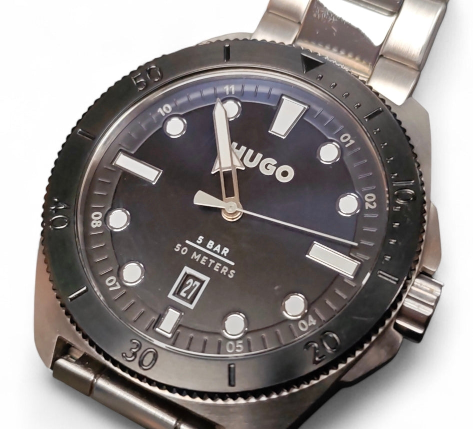 The Hugo Boss Visit watch (often model is a stylish quartz timepiece for men, known for its stainless steel case (around 44mm), black dial with luminous markers, date function, and stainless steel strap, offering 50m water resistance for versatile, everyday wear. It blends modern design with classic elements, featuring Japanese quartz movement for accuracy, making it a popular choice for both casual and formal occasions.