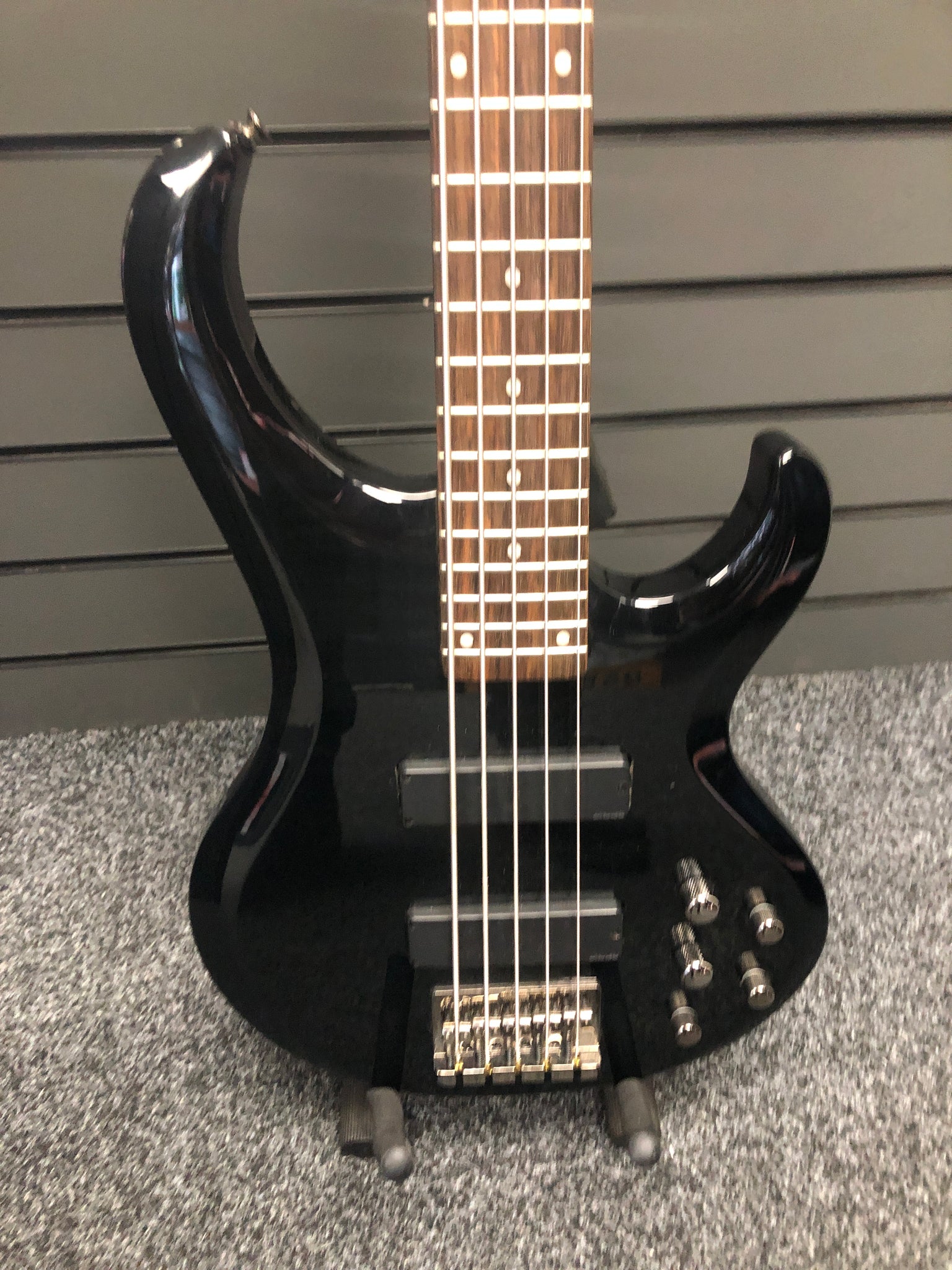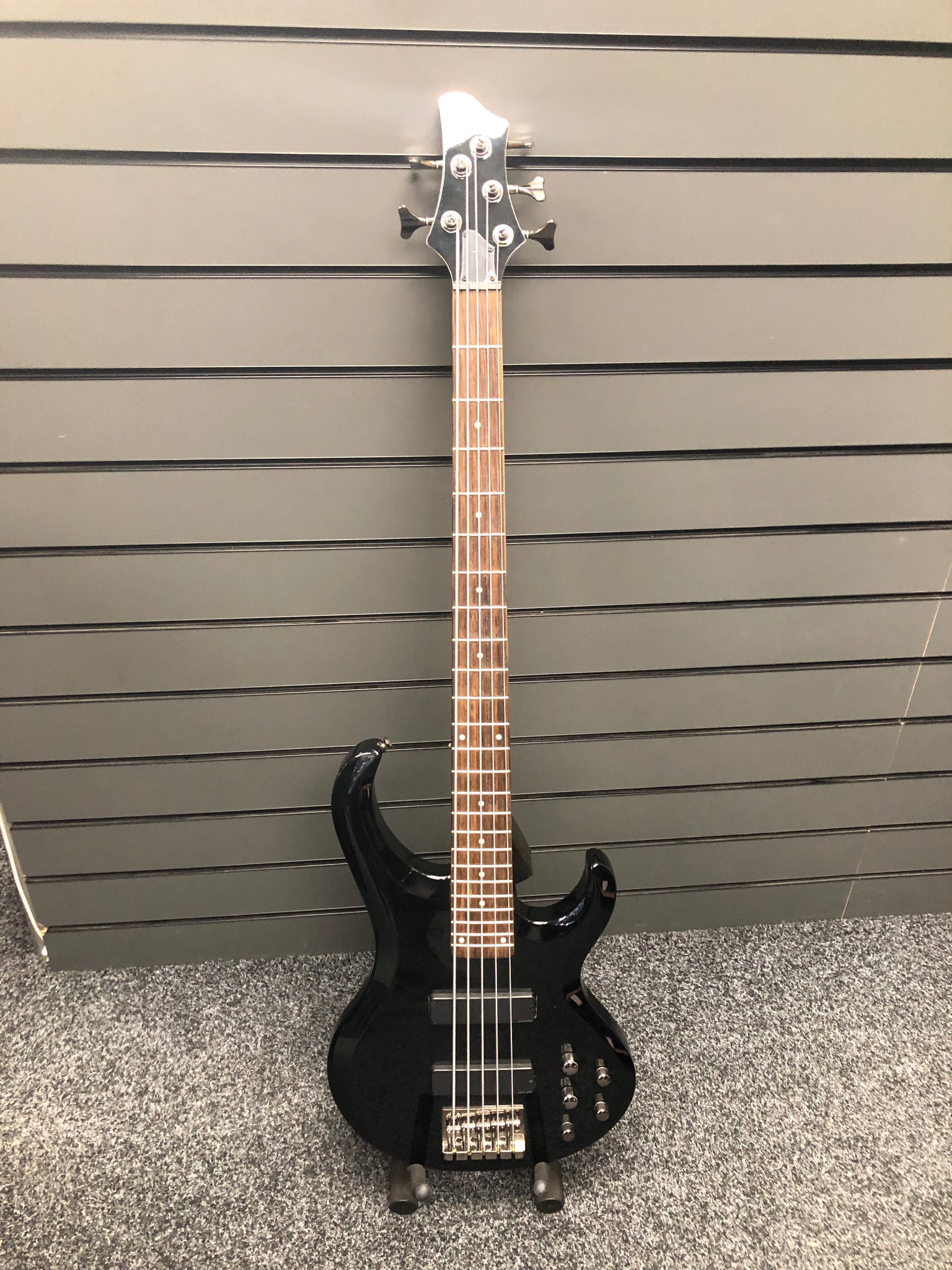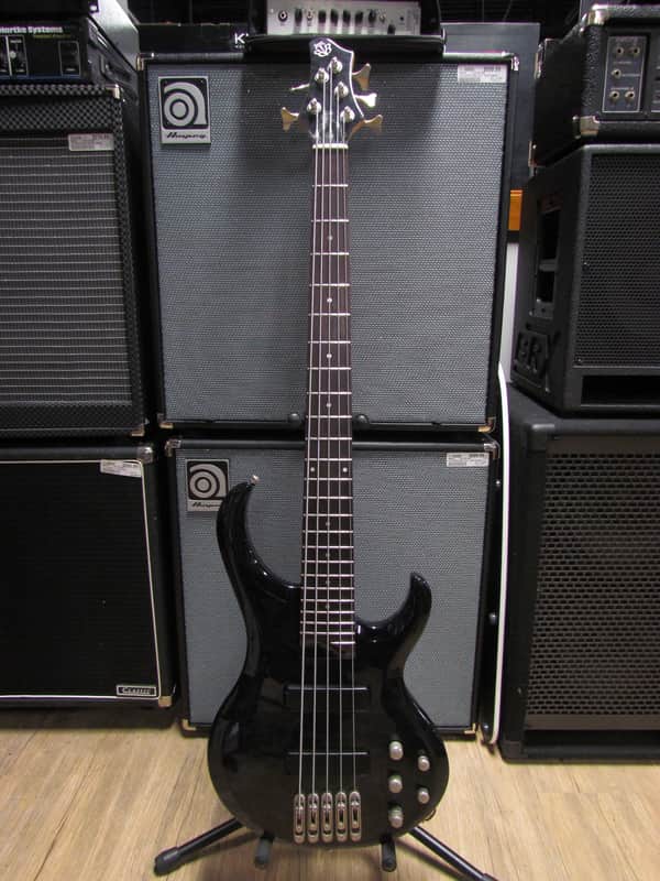 A Michael Tobias-designed 5-string electric bass from Ibanez. This model features a 5-bolt 5-piece neck with Tobias's signature asymmetric profile giving it a little more thickness on the bass side. The electronics are two Ibanez passive pickups with 3-band active equalization requiring 18v of power (2 9v batteries). The input is a Neutrik locking jack ensuring your cable won't accidentally pop out during a performance (I know from experience it's pretty embarrassing). Earth-shaking lows and snappy highs.