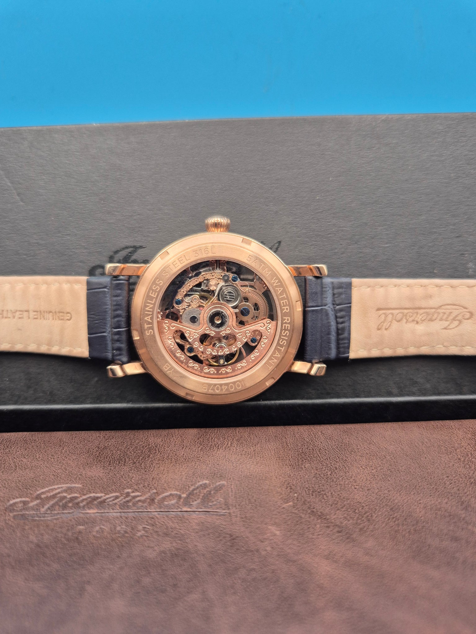 Ingersoll The Herald I00407B is a stylish men's skeleton wristwatch with a 40 mm wide and 14 mm thick rose gold colored stainless steel case. It is fitted with a blue leather strap with a width of 20 mm at the attachment point. A bullseye skeleton dial is protected under the mineral glass. The Ingersoll I00407B is water resistant to 50m/5atm, which means it has limited water resistance (swimming is not recommended)
