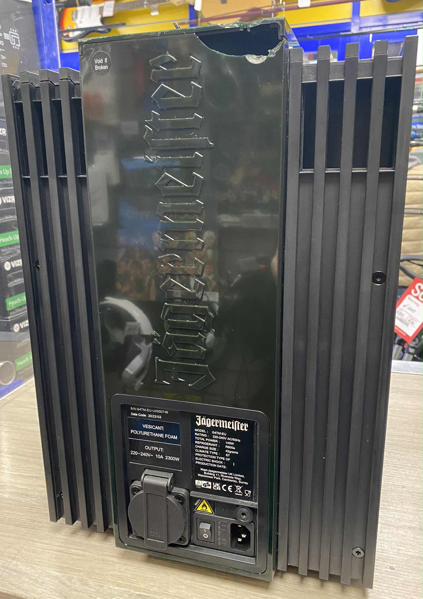 Jagermeister Three Bottle Tap Machine Comes with a lead Lights up Keep drinks chilled at -18°C Minor cosmetic scratches and crack in the back as it is seen in photo Good working condition Unboxed
