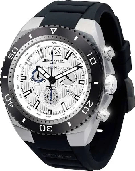 Striking a balance between stylish and sporty, this Jorg Gray Chronograph Quartz wristwatch exemplifies an active, sophisticated lifestyle. With finely crafted details and a scratch resistant crystal, it's just the thing to go straight from the office to the weekend.