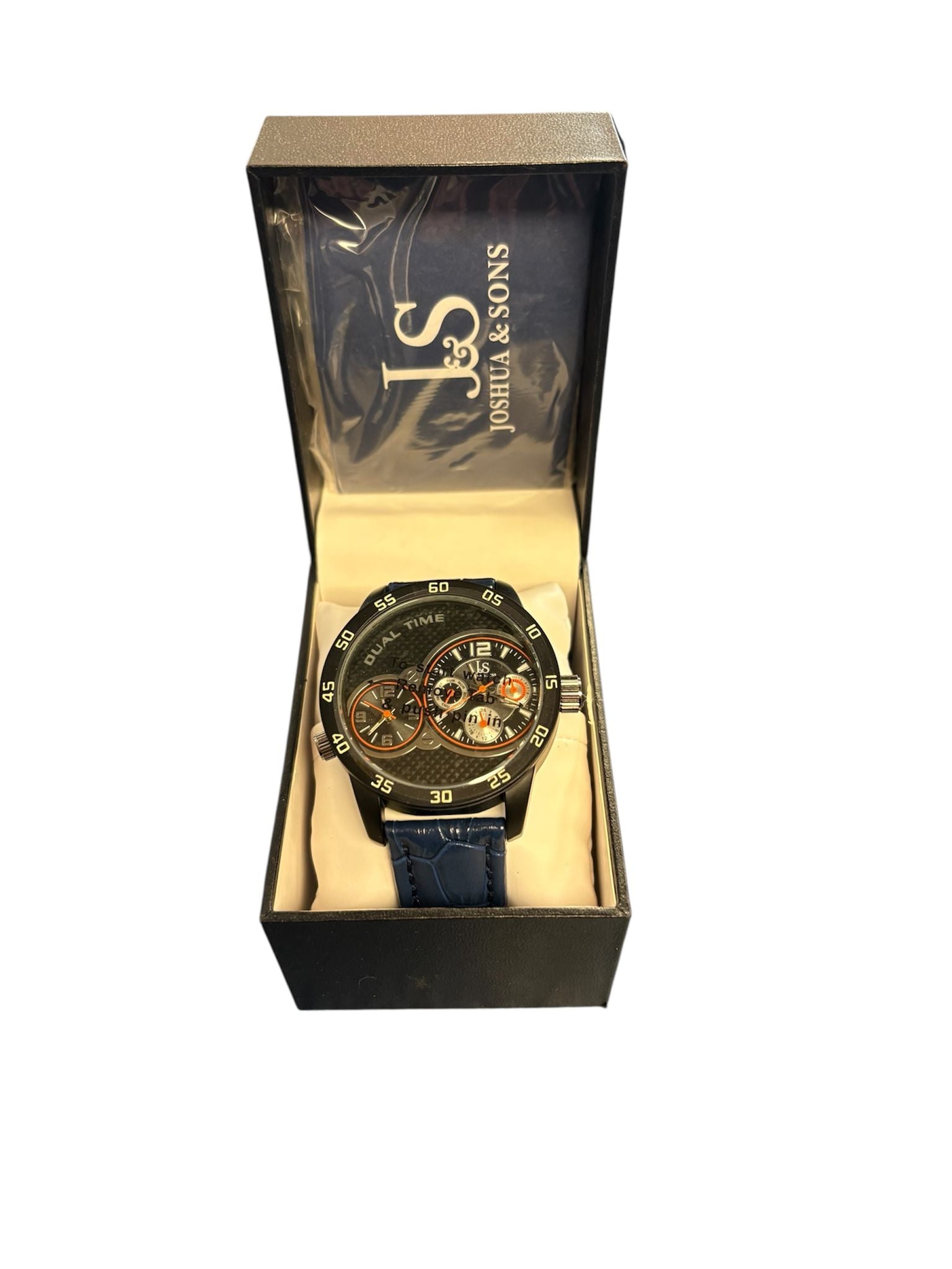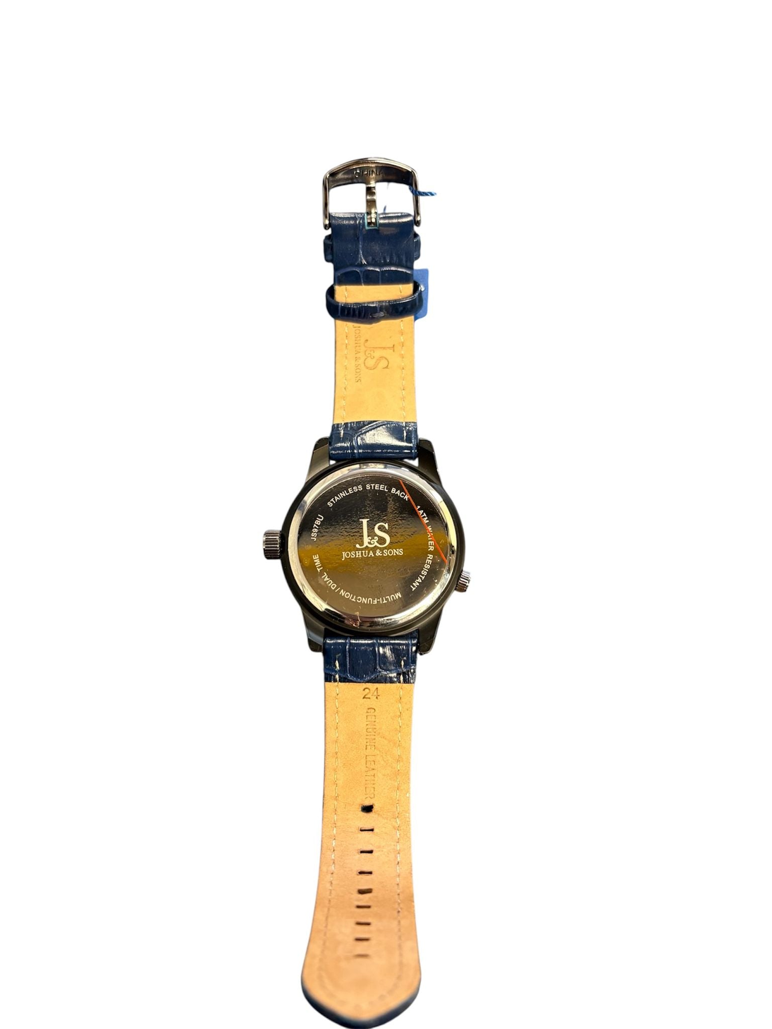 Movement: Japanese Quartz, featuring accurate timekeeping. Case Size: Approximately 49mm to 50mm, with a thickness of about 13mm. Case Material: Alloy with a stainless steel snap-down case back. Functionality: Multi-function dials, typically displaying: Date subdial (at 3 o'clock) Day subdial (at 9 o'clock) 24-hour indicator/GMT Dial: Embossed pattern with decorative screws and luminous hands/markers. Water Resistance: Generally rated for 1 ATM (10 meters/33 feet), which is suitable for light, accidental splashes but not for swimming. Strap: Genuine leather, often with an alligator or embossed pattern