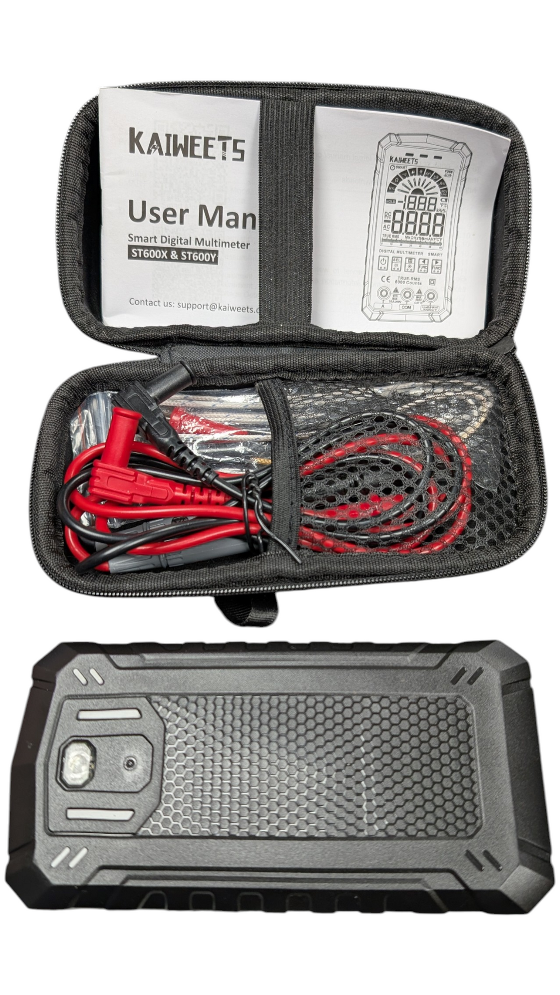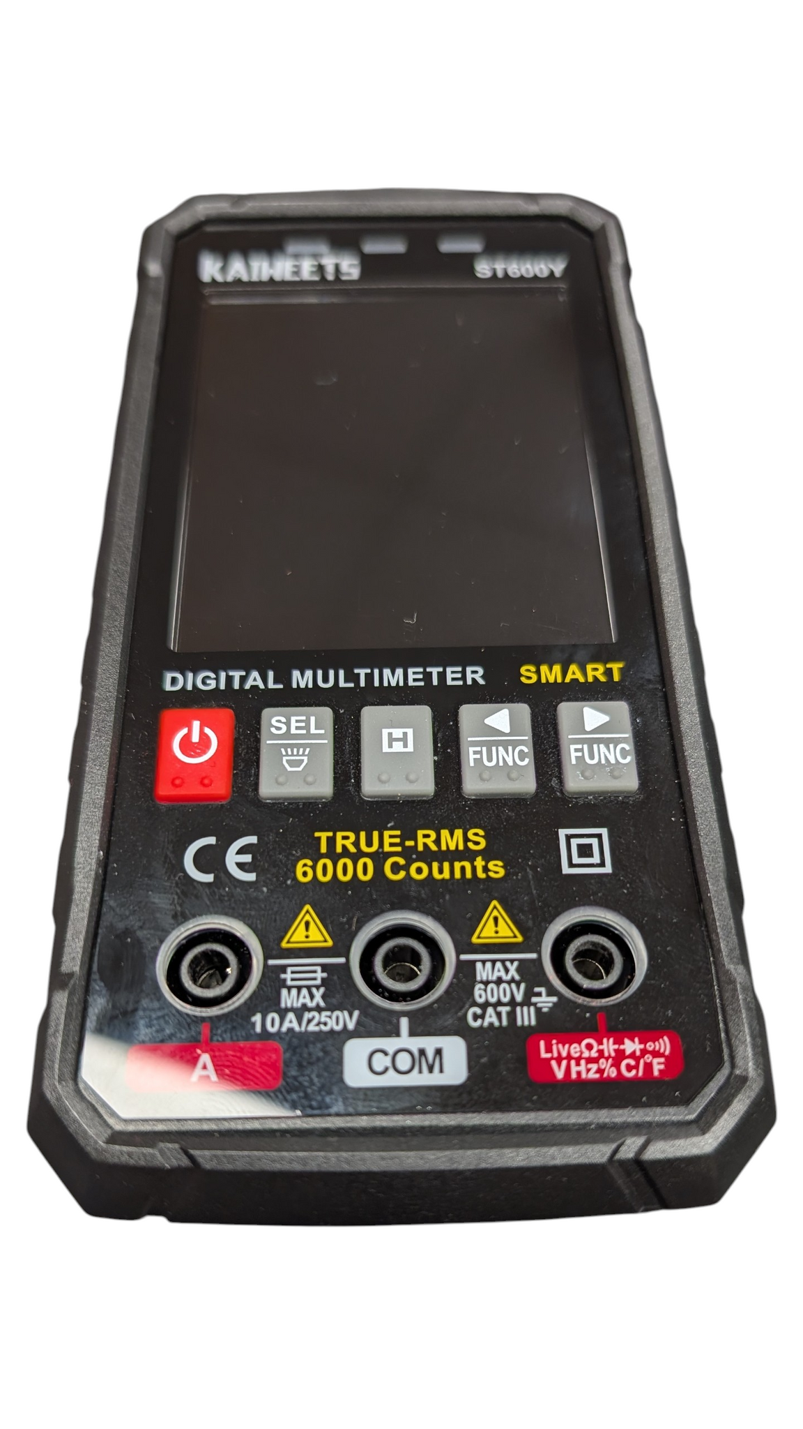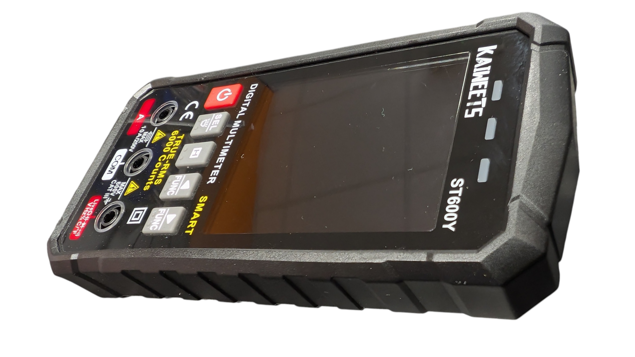 Auto Mode: It has an ‘auto’ setting that allows it to automatically recognize what it's measuring and act accordingly, for the most common measurements, Volts AC or DC, resistance, or continuity. All you need to do in this smart mode is attach the probes, and it will work. Multi-Function: The ST600 multimeter can measure max 600V AC/DC voltage, 10A AC/DC current, and 60M Ohms resistance, the tester also tests temperature, capacitance, frequency, duty-cycle, wire on-off, diodes and continuity. Upgraded & Convenient: Replace the gear knob with 2 buttons, use it like a smartphone. More convenient than a meter with only 1 function button, you can manually select the function to the left or right. The jack is on the front, so the multimeter can be placed upright. Safety First: The kit comes in a semi-hard zipped case, the multi meter has a snug rubber case that fits around the back and sides for additional protection. IEC Rated CAT III 1000V, CAT IV 600V, CE, RoHS certified. Anti-Burn with double ceramic fuse and thermistor protection circuit. High Voltage Protection is active on all ranges. Coloured Indication: It is shaped like a phablet with an LCD screen that is bright and clear. Different colours separate readings from functions and make the results easier to record. It has a led light at the back, a indicator light on the top and 3 flashing lights on the port, looks good and easy to use.