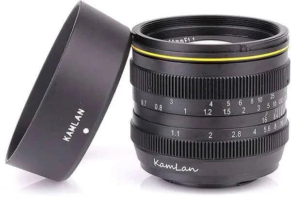 Product description The Kamlan 52mm f/1.1 manual focus lens is designed for mirrorless camera, with sensors as big as APS-C, which delivers top grade image quality, regardless of weak lighting conditions. This lens provides bright F1.1 aperture at fixed focal lengths 50mm, equivalent to 135 full width of 100mm focal length. The extremely shallow depth of field at open aperture produces portraits and detailed studies of unequalled aesthetic effect. It also provides outstanding fast and accurate shutter speed by achieving great amount of light. Fascinating Blur Amazing maximum aperture of F1.1, which creates fascinating background blur effect and sharper image quality, even in weak lighting conditions. Fast & Sharp Ensures low image distortion, excellent image sharpness and contrast. 50mm focal length is equivalent to 75mm on APS-C camera. Perfect for portraits shooting. Prior To Use Do not leave the lens pointed at the sun or another sight source for an extended period. Intense light may cause the image sensor to deteriorate or produce a white blur effect in photographs Do the best you can to try to avoid using the camera on high humidity days and during wet weather. Stay out of the rain If your camera does become wet, you're expected to dry it immediately Specifications-Focal Length: 50mm-Aperture: F1.1-F16-Visual angle range: 31'@ APS-C-Filter diameter: 52mm-Minimum Object Distance: 0.5m-Focus type: Manual-Lens structure: 5 groups 5 elements-Net Weight: 248g-Lens Size: 60x60mm Package Includes1x Lens1x Lens hood1x Front lens cap1x Rear lens cap1x Microfiber Cleaning Cloth | Kamlan 50mm F1.1 APSC Large Aperture Manual Focus Lens Standard Lens for Mirrorless Cameras