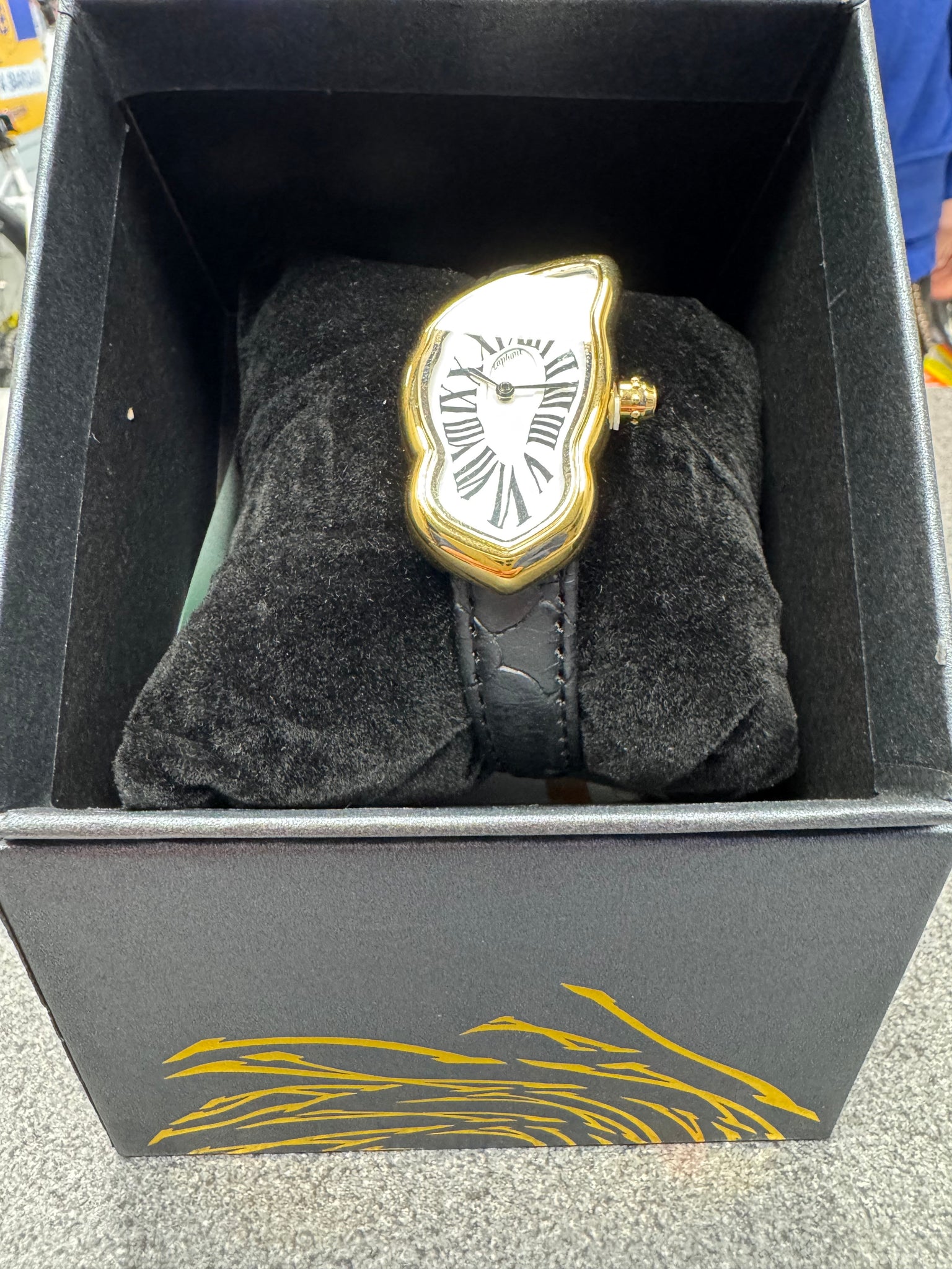 The Laphont Melting Watch is an artistic, Surrealism-inspired timepiece influenced by Salvador Dalí, featuring an asymmetric, "melted" case design reminiscent of a warped Cartier Tank or Patek Philippe Nautilus. Available in gold-plated or chromium alloy-plated brass, these watches use Japanese Miyota quartz movements, leather straps, and come in various sizes (e.g., 36mm-40mm height)