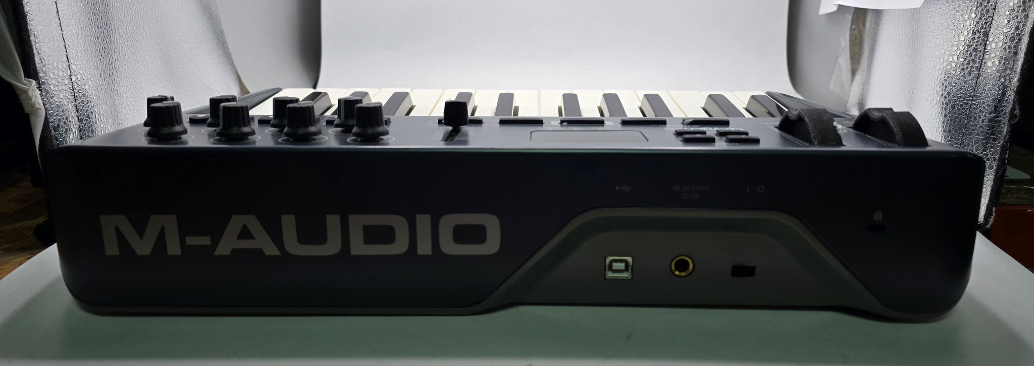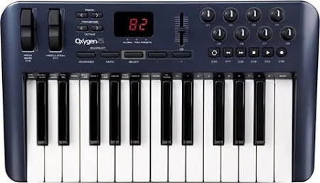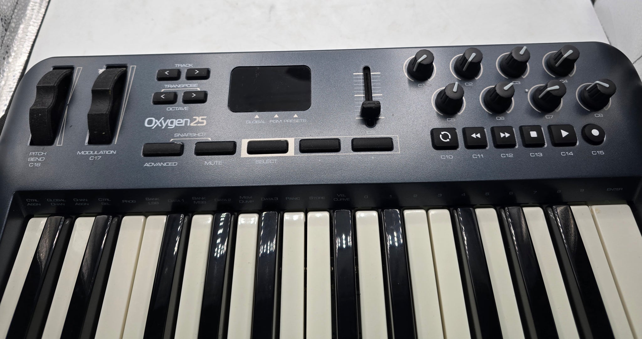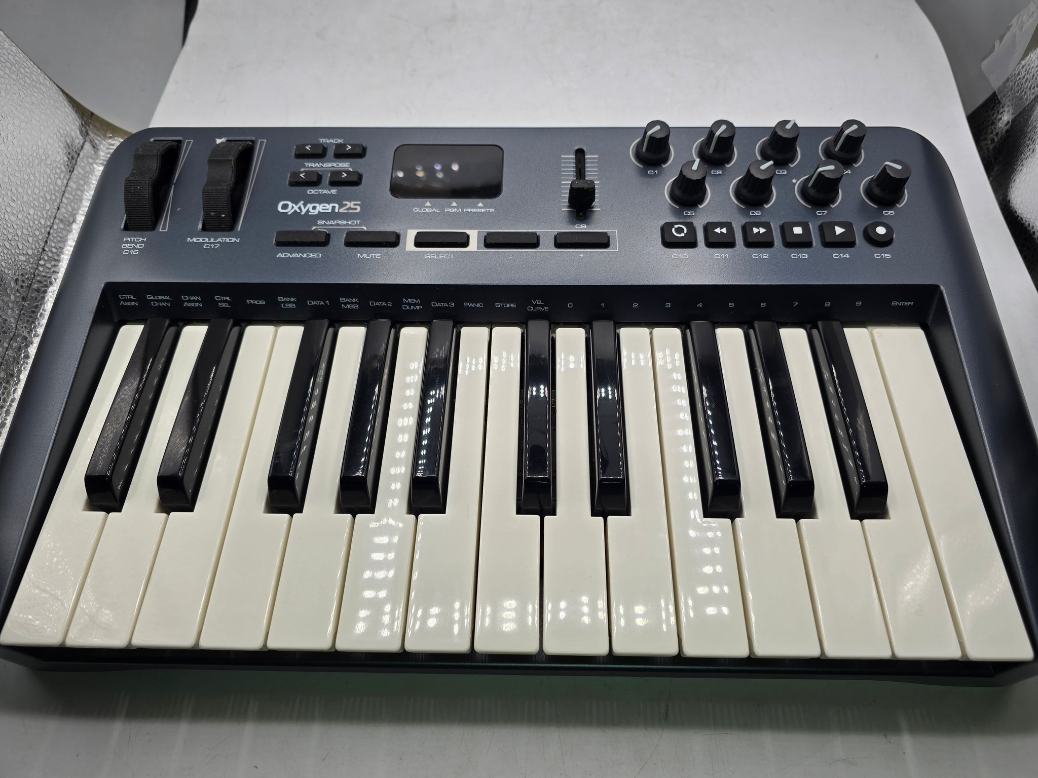 Have full control of your latest production with this portable Oxygen 25 USB MIDI controller from M-Audio. With 25 velocity-sensitive keys, 8 assignable knobs, and 6 dedicated transport controls, you'll have everything you need at your fingertips unboxed, good condition , no wires included.