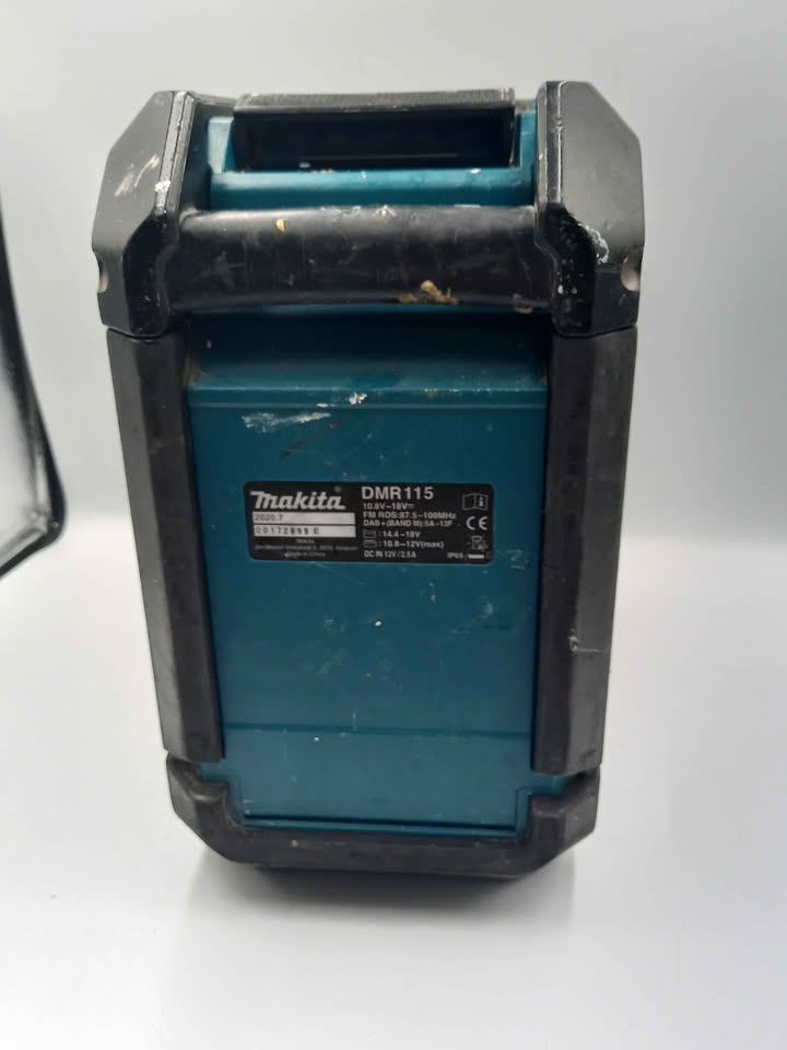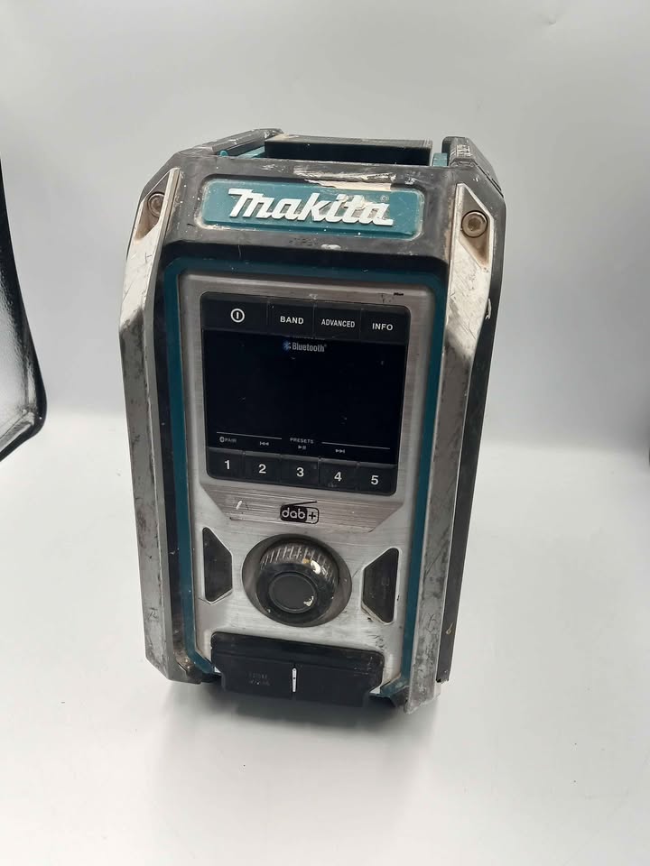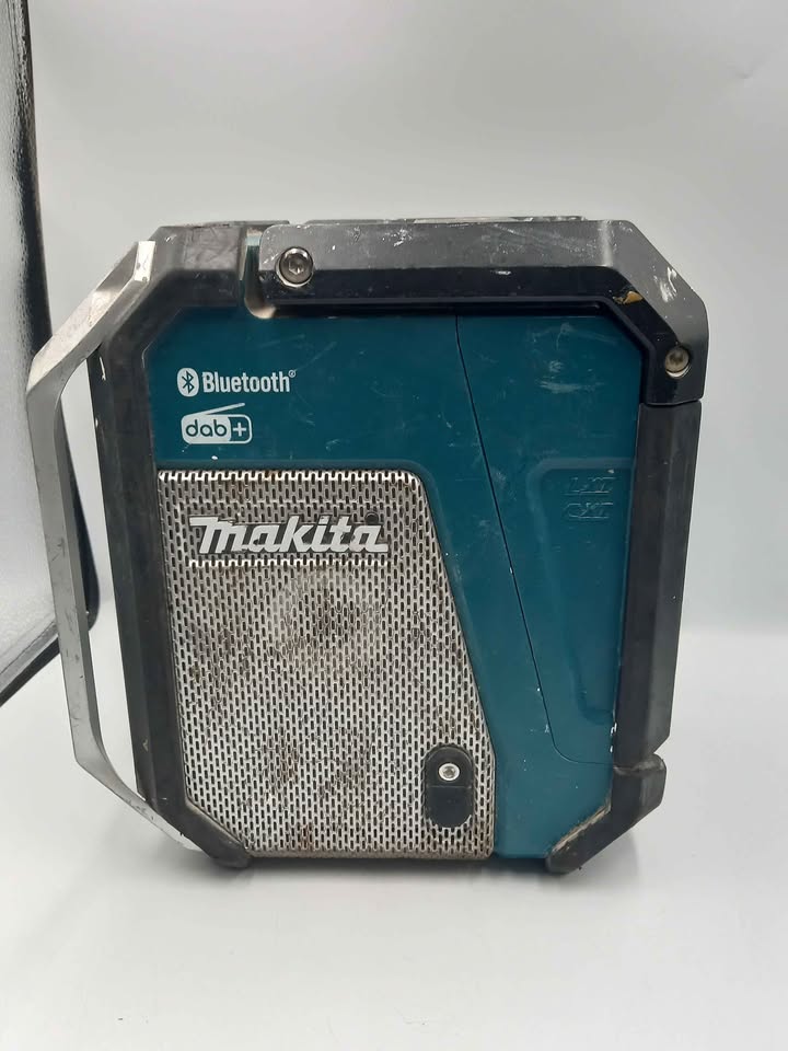 Key Features and Description: Superior Sound System: Equipped with two 5W side-firing speakers and a 25W subwoofer at the base for rich, high-quality audio with deep bass. Power Source Flexibility: Operates on 18V LXT or 10.8V/12V MAX CXT Makita Lithium-Ion batteries, or via the included AC mains adapter. Rugged Durability: IP65 rated for dust and water resistance, designed to withstand harsh, wet, or dusty job site conditions. It features protective Elastomer bumpers and a high-grade aluminium diecast guard. Bluetooth & Connectivity: Bluetooth version 5.0 allows streaming from mobile devices with an optimal range of 10m (max 30m). Also features an AUX-in jack for wired connections. Built-in Aerial: The FM antenna is integrated directly into the carry handle to prevent damage or loss. Charging Port: Includes a USB output port (2.4A) to charge mobile devices while in use. User Interface: Features a color display, six selectable sound modes (with LED indicator), and a "My Equalizer" (MY EQ) mode to independently adjust bass, mid, and treble